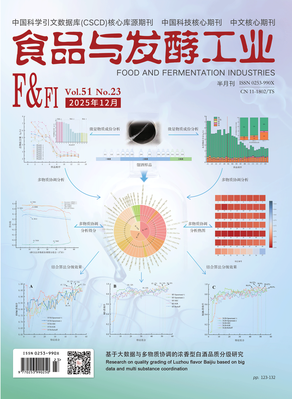 该研究以具有酪胺降解能力的枯草芽孢杆菌T2为出发菌株,系统解析该菌株对细菌型豆豉发酵过程中非挥发性和挥发性物质组成演变的影响规律。研究结果表明,在不同发酵阶段的豆豉样品中共检测出16种游离氨基酸、10种游离脂肪酸和37种挥发性物质,游离氨基酸的总含量随发酵时间的延长不断增加,而游离脂肪酸和挥发性物质则未表现出该趋势。电子鼻和气相色谱-质谱联用仪检测结果显示,豆豉发酵5 d和发酵10 d的挥发性风味物质组成最为相似。发酵结束时,豆豉样品中苦味氨基酸的总含量最高,占总游离氨基酸含量的52.6%,其次为甜味氨基酸(24.3%)和鲜味氨基酸(22.6%),谷氨酸是含量最高的游离氨基酸(1 887.2 μg/g),它是构成豆豉鲜味的重要组分;共检测出6种饱和脂肪酸和4种不饱和脂肪酸,发酵结束时,不饱和脂肪酸的总含量占了游离脂肪酸总含量的76.9%,其中单不饱和脂肪酸的相对含量在发酵过程中呈下降趋势,而多不饱和脂肪酸则呈先增加后降低的趋势;豆豉样品的挥发性物质主要为吡嗪类物质,其中2,5-二甲基吡嗪和2,3,5-三甲基吡嗪在豆豉发酵的5~10 d占主导地位,此外,正交偏最小二乘判别分析结果表明,16种挥发性风味物质是导致各发酵组之间存在差异的关键化合物;最后,通过综合聚类分析推断枯草芽孢杆菌T2发酵豆豉的最佳周期为10 d。以上结果为酪胺降解菌株在豆豉发酵中的应用提供了参考和依据。
