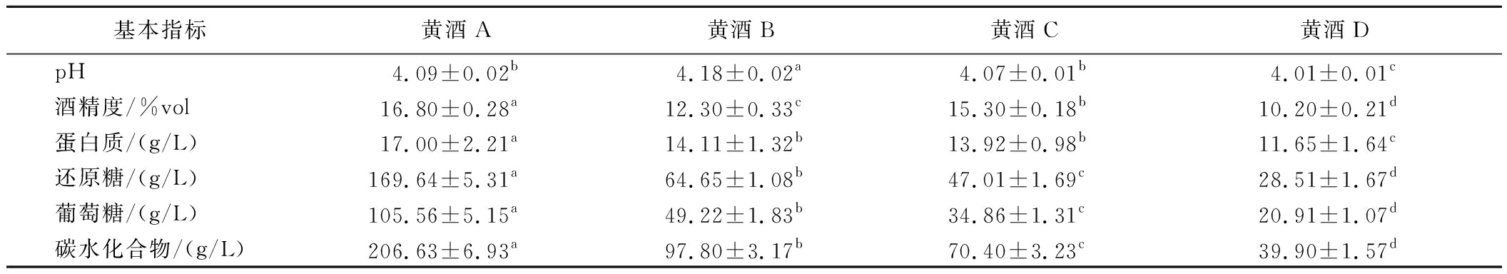 基本指标黄酒A黄酒B黄酒C黄酒DpH4.09±0.02b4.18±0.02a4.07±0.01b4.01±0.01c酒精度/%vol16.80±0.28a12.30±0.33c15.30±0.18b10.20±0.21d蛋白质/(g/L)17.00±2.21a14.11±1.32b13.92±0.98b11.65±1.64c还原糖/(g/L)169.64±5.31a64.65±1.08b47.01±1.69c28.51±1.67d葡萄糖/(g/L)105.56±5.15a49.22±1.83b34.86±1.31c20.91±1.07d碳水化合物/(g/L)206.63±6.93a97.80±3.17b70.40±3.23c39.90±1.57d