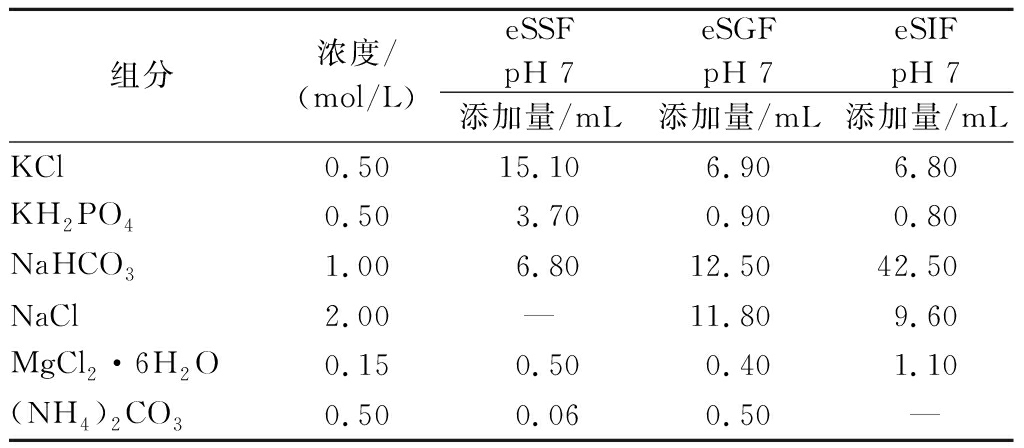 注:为了添加其他溶液[如CaCl2·2H2O、酶]以及调节pH,电解质储备溶液是1.25倍浓缩液,即400 mL电解质储备溶液可配制500 mL模拟消化液;—表示无数据。