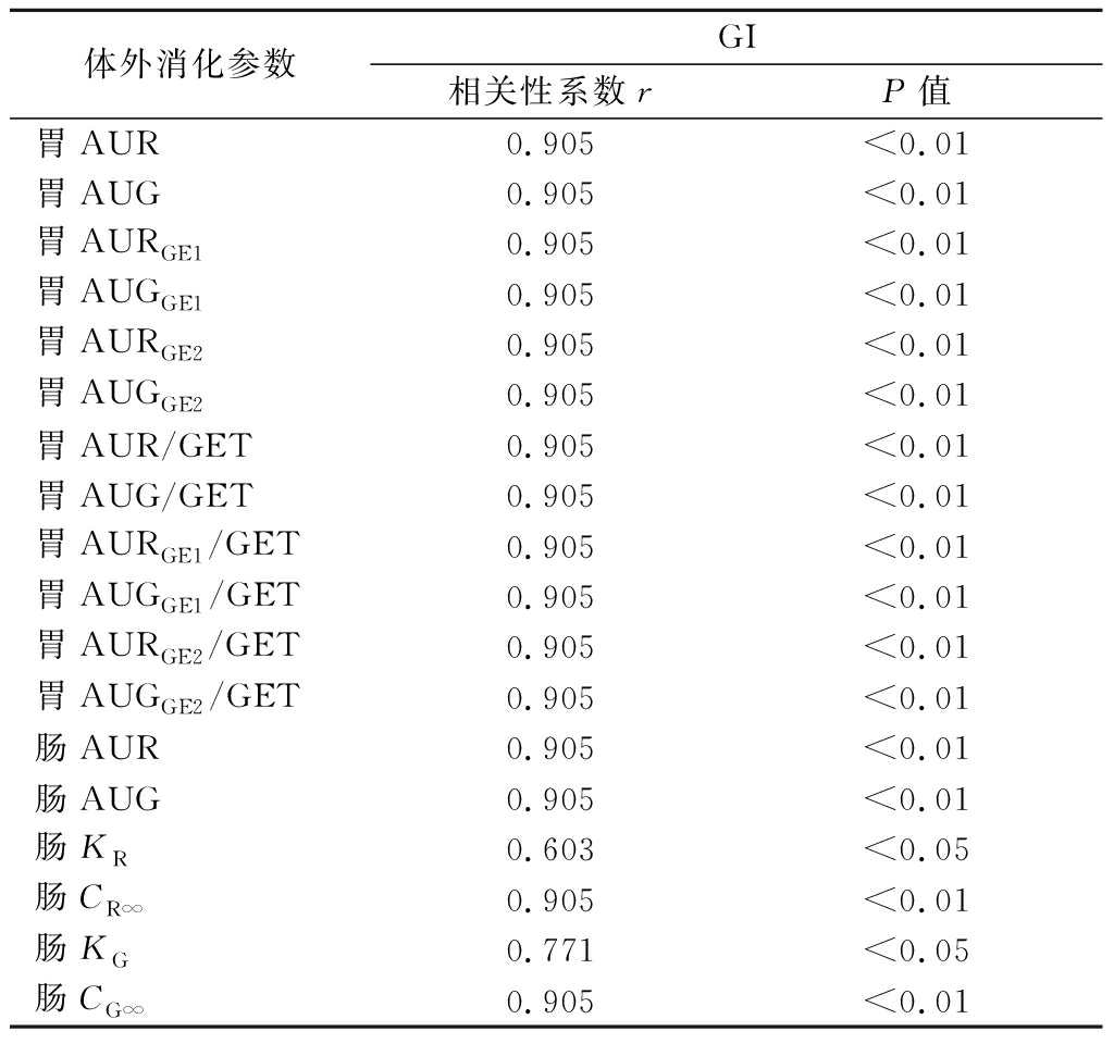 体外消化参数GI相关性系数rP值胃AUR0.905<0.01胃AUG0.905<0.01胃AURGE10.905<0.01胃AUGGE10.905<0.01胃AURGE20.905<0.01胃AUGGE20.905<0.01胃AUR/GET0.905<0.01胃AUG/GET0.905<0.01胃AURGE1/GET0.905<0.01胃AUGGE1/GET0.905<0.01胃AURGE2/GET0.905<0.01胃AUGGE2/GET0.905<0.01肠AUR0.905<0.01肠AUG0.905<0.01肠KR0.603<0.05肠CR∞0.905<0.01肠KG0.771<0.05肠CG∞0.905<0.01