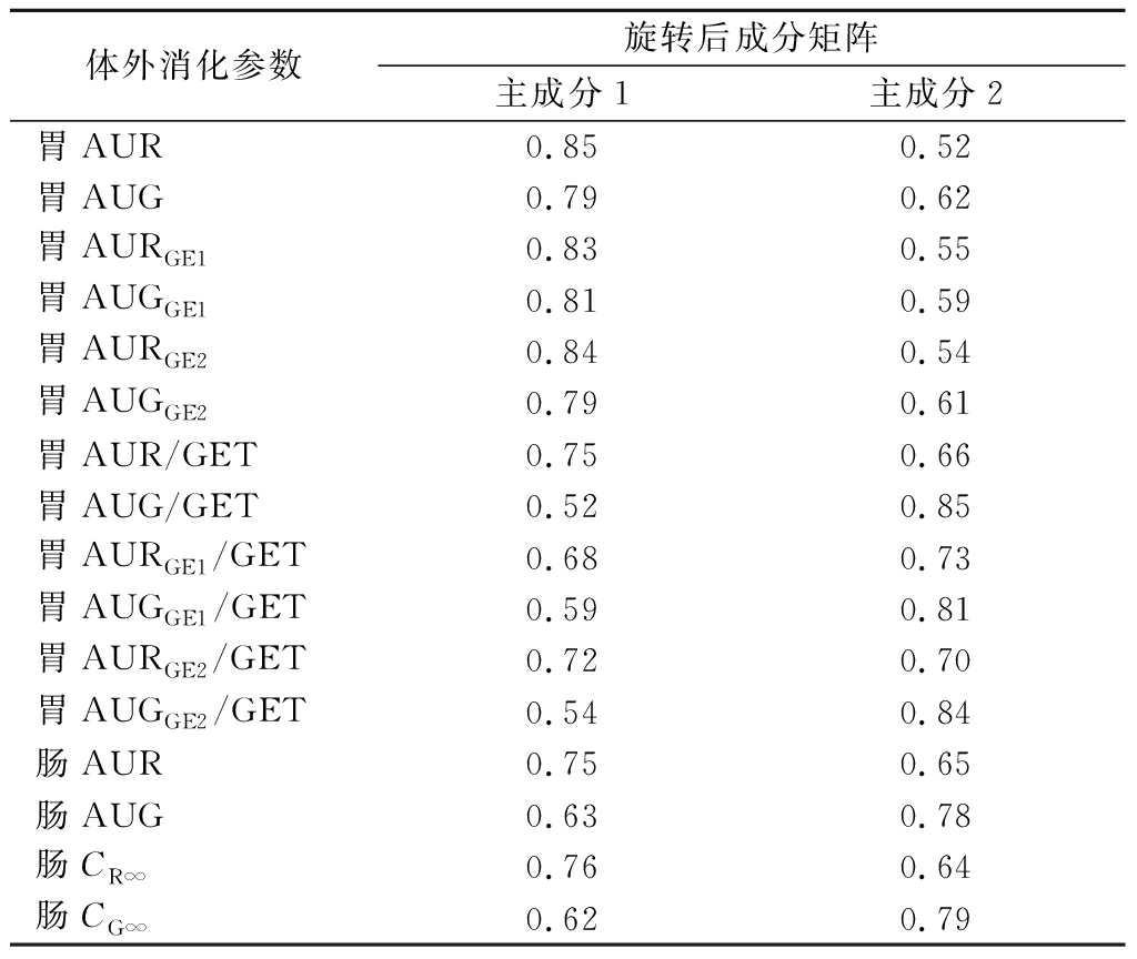 体外消化参数旋转后成分矩阵主成分1主成分2胃AUR0.850.52胃AUG0.790.62胃AURGE10.830.55胃AUGGE10.810.59胃AURGE20.840.54胃AUGGE20.790.61胃AUR/GET0.750.66胃AUG/GET0.520.85胃AURGE1/GET0.680.73胃AUGGE1/GET0.590.81胃AURGE2/GET0.720.70胃AUGGE2/GET0.540.84肠AUR0.750.65肠AUG0.630.78肠CR∞0.760.64肠CG∞0.620.79