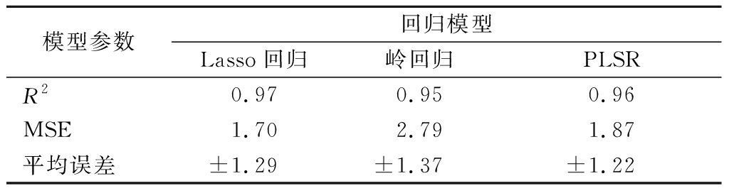模型参数回归模型Lasso回归岭回归PLSRR20.970.950.96MSE1.702.791.87平均误差±1.29±1.37±1.22