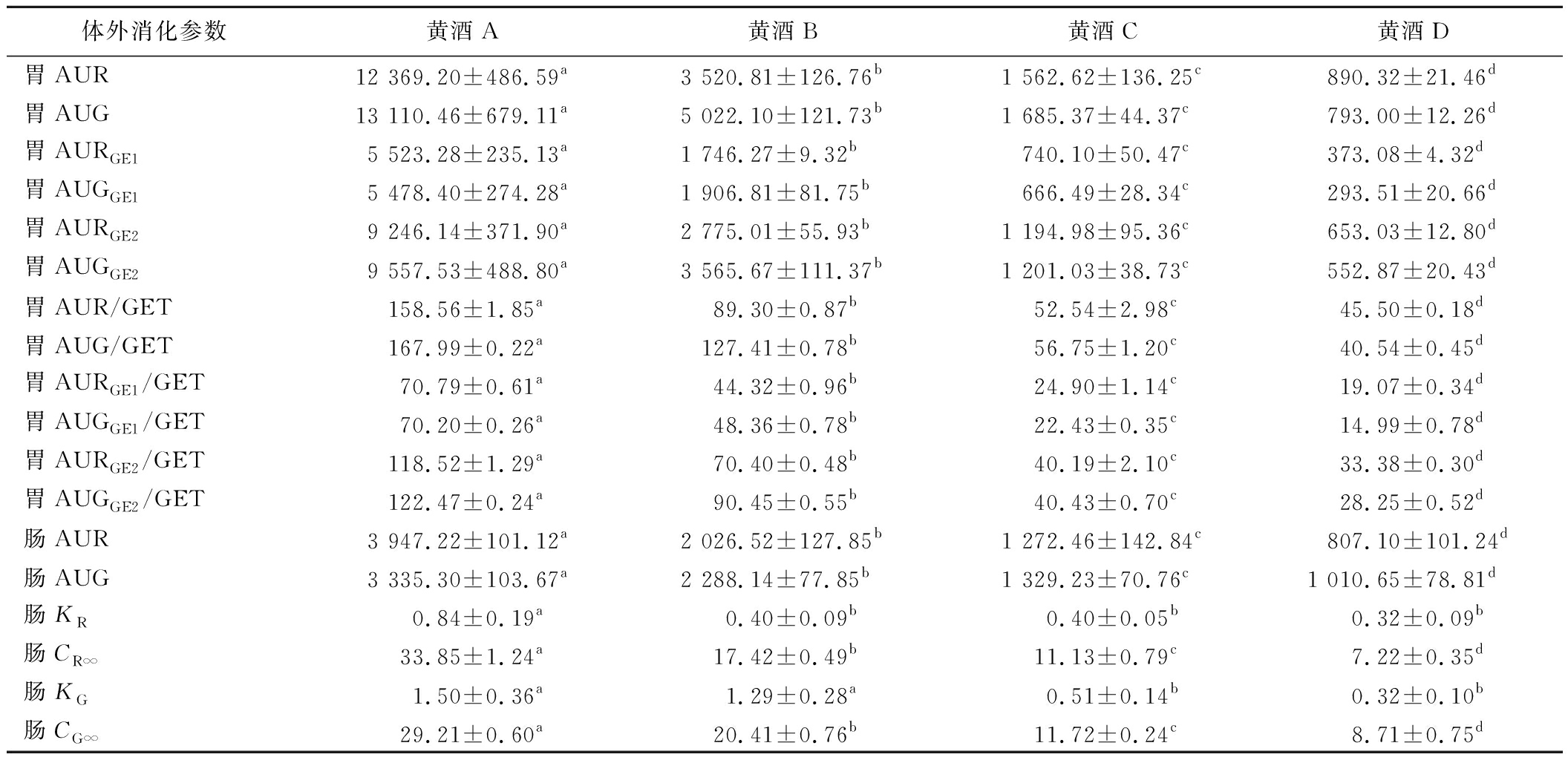 体外消化参数黄酒A黄酒B黄酒C黄酒D胃AUR12 369.20±486.59a3 520.81±126.76b1 562.62±136.25c890.32±21.46d胃AUG13 110.46±679.11a5 022.10±121.73b1 685.37±44.37c793.00±12.26d胃AURGE15 523.28±235.13a1 746.27±9.32b740.10±50.47c373.08±4.32d胃AUGGE15 478.40±274.28a1 906.81±81.75b666.49±28.34c293.51±20.66d胃AURGE29 246.14±371.90a2 775.01±55.93b1 194.98±95.36c653.03±12.80d胃AUGGE29 557.53±488.80a3 565.67±111.37b1 201.03±38.73c552.87±20.43d胃AUR/GET158.56±1.85a89.30±0.87b52.54±2.98c45.50±0.18d胃AUG/GET167.99±0.22a127.41±0.78b56.75±1.20c40.54±0.45d胃AURGE1/GET70.79±0.61a44.32±0.96b24.90±1.14c19.07±0.34d胃AUGGE1/GET70.20±0.26a48.36±0.78b22.43±0.35c14.99±0.78d胃AURGE2/GET118.52±1.29a70.40±0.48b40.19±2.10c33.38±0.30d胃AUGGE2/GET122.47±0.24a90.45±0.55b40.43±0.70c28.25±0.52d肠AUR3 947.22±101.12a2 026.52±127.85b1 272.46±142.84c807.10±101.24d肠AUG3 335.30±103.67a2 288.14±77.85b1 329.23±70.76c1 010.65±78.81d肠KR0.84±0.19a0.40±0.09b0.40±0.05b0.32±0.09b肠CR∞33.85±1.24a17.42±0.49b11.13±0.79c7.22±0.35d肠KG1.50±0.36a1.29±0.28a0.51±0.14b0.32±0.10b肠CG∞29.21±0.60a20.41±0.76b11.72±0.24c8.71±0.75d