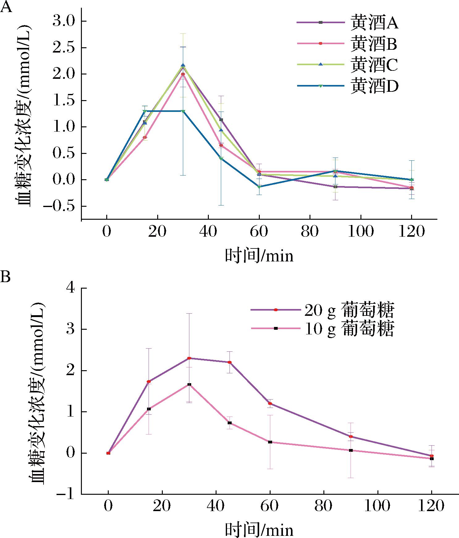 参照WS/T 652—2019《食物血糖生成指数测定方法》进行黄酒体内血糖的测定实验,黄酒与参考食物(葡萄糖)的血糖应答增量曲线如图2-A和图2-B所示。