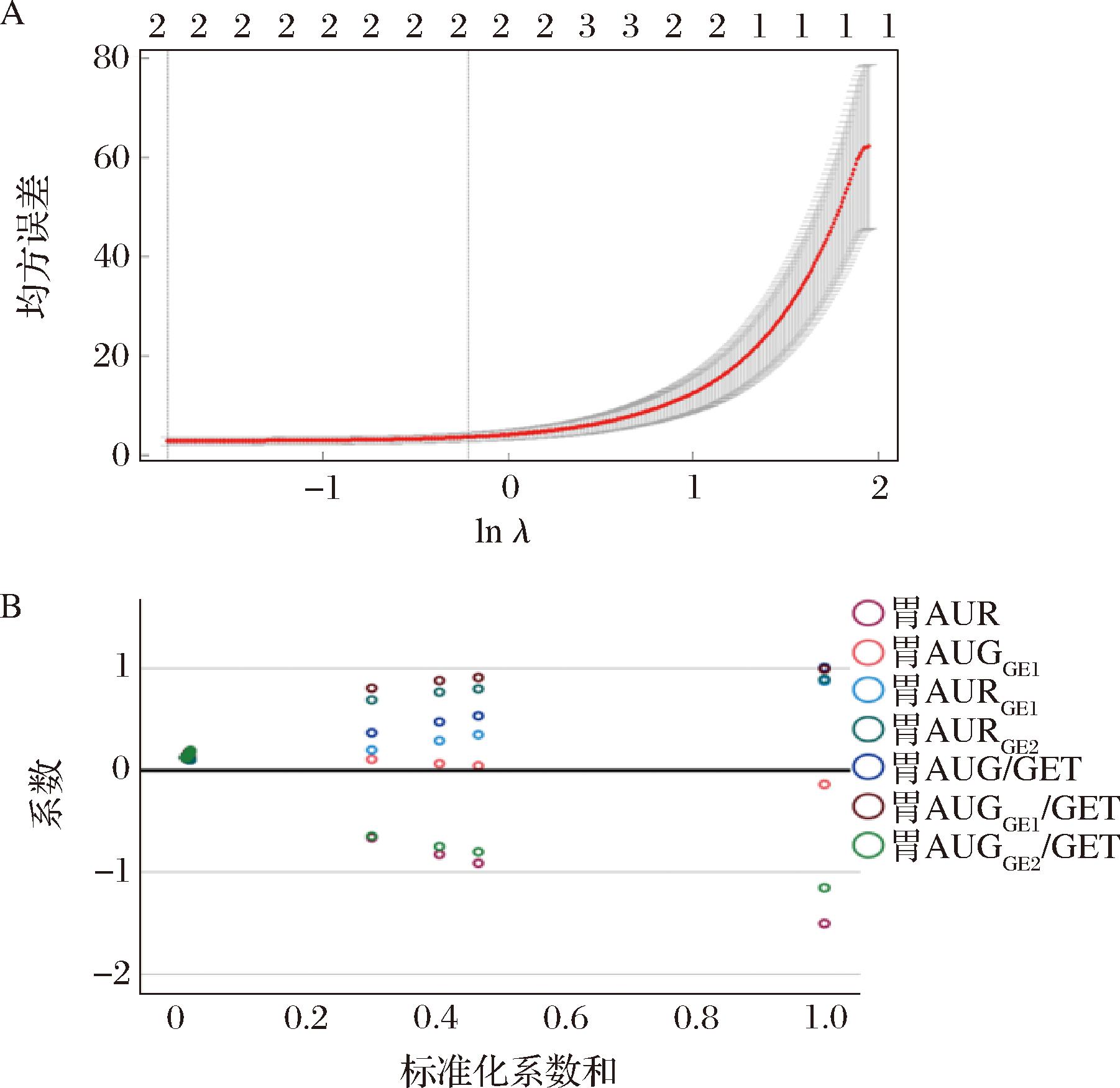 对于Lasso回归而言,通过10折交叉验证(图3-A)确定最佳变量为2个,最佳变量为胃AURGE1和胃AUGGE1/GET。岭回归中,通过岭路径图(图3-B)确定各个自变量的标准化回归系数趋于稳定时的最小K值为0.200,保留所有变量。对于PLSR而言,随着模型组件个数的增加,R2X、R2Y和Q2均逐渐增加,交叉验证确定最佳组件变量个数为1,最佳变量为胃AUGGE1/GET。