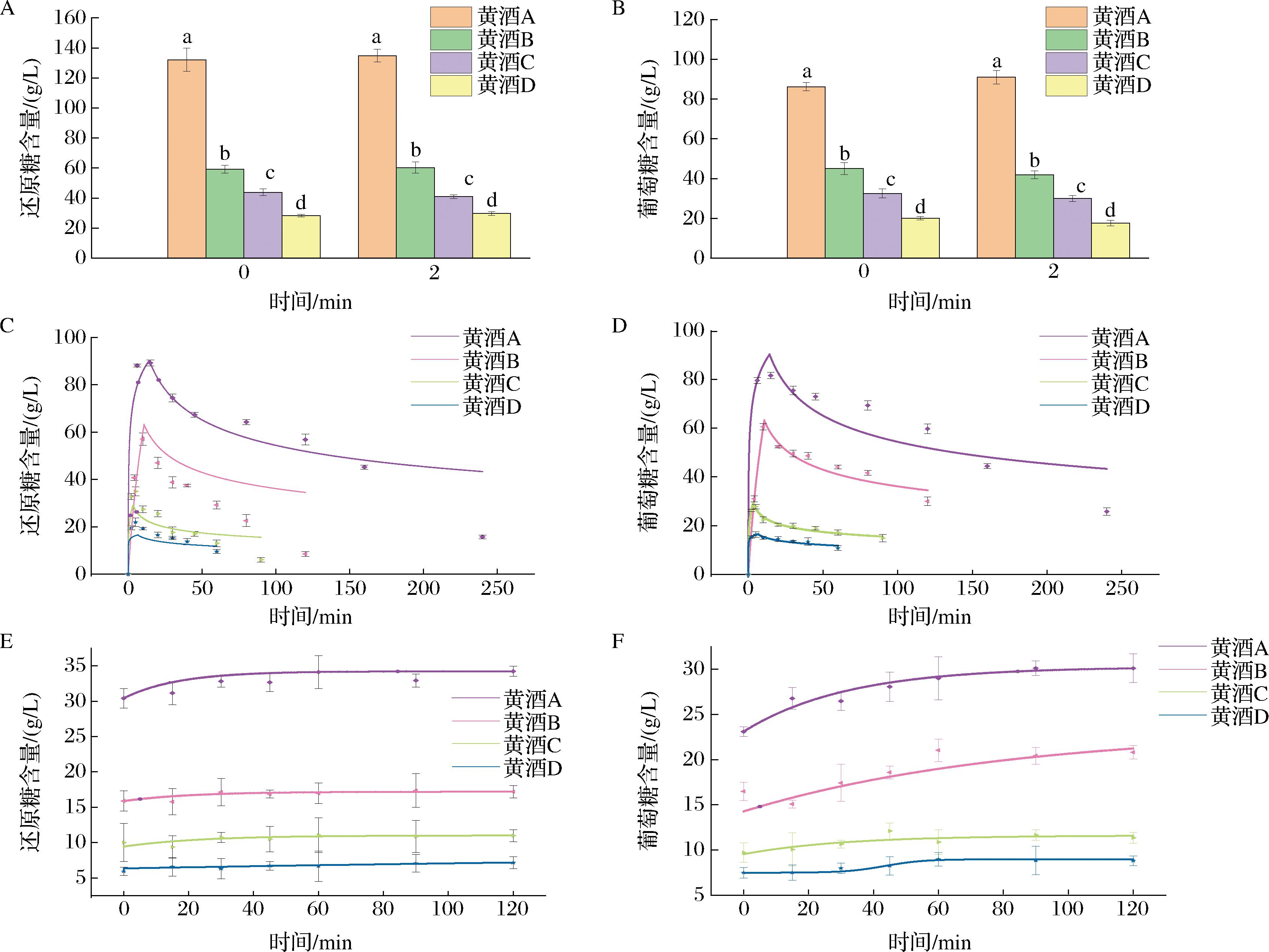运用NLLS对不同甜型黄酒胃消化阶段的不同时间点测得的还原糖和葡萄糖含量进行拟合,得到的拟合曲线如图1-C和图1-D所示。类似的,运用NLLS对不同甜型黄酒肠消化阶段的不同时间点测得的还原糖和葡萄糖含量进行拟合,得到的拟合曲线如图1-E和图1-F所示。