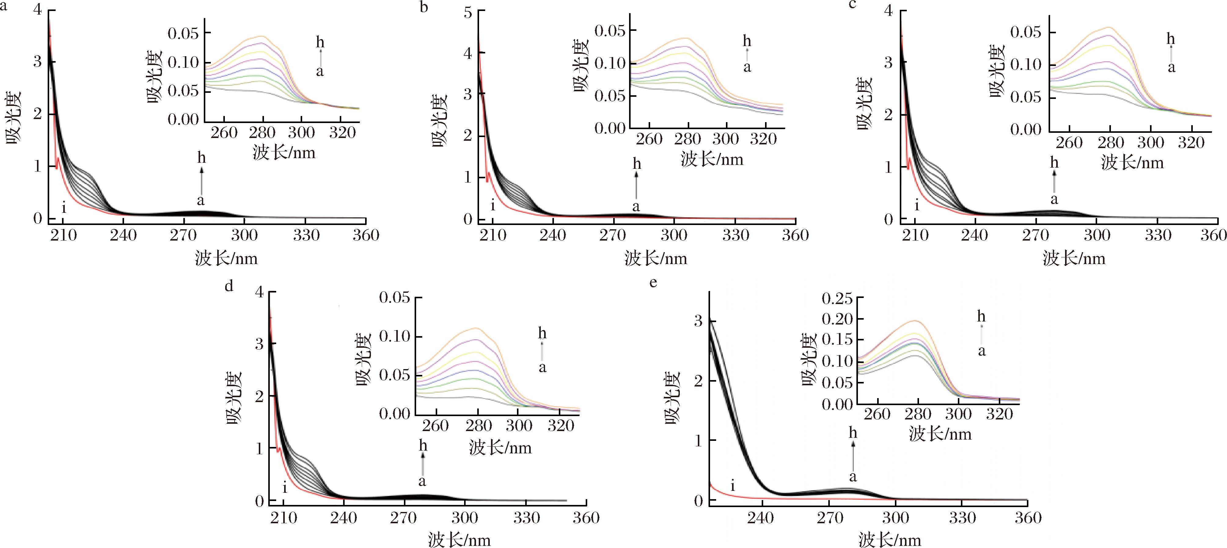参考王浩林[13]、申炳俊等[14]方法,并作适当修改。为了确保实验的准确性,分别量取0、12、24、36、48、60、72、84 μL的Trp、EW、EEW、EEEW、EEEEW储备液(1.0×10-3 mol/L),将溶液均匀分配至8个10 mL的离心管中。接着,向各离心管中添加120 μL的HSA储备液(1.0×10-4 mol/L),Tris-HCl缓冲液定容,至总体积至4 mL,得到HSA与Trp、EW、EEW、EEEW、EEEEW的浓度比分别为1∶0、1∶1、1∶2、1∶3、1∶4、1∶5、1∶6和1∶7的混合液。在第9个10 mL的离心管中,加入12 μL的Trp、EW、EEW、EEEW、EEEEW溶液(1.0×10-3 mol/L)作为未添加蛋白的空白对照组,用Tris-HCl缓冲液定容至4 mL。在20 ℃的室温下静置30 min,以确保反应完全。最后,以相应浓度的Trp、EW、EEW、EEEW、EEEEW溶液作为参比,进行光谱分析,吸收波长在200~400 nm测量,以研究其光学性质。
