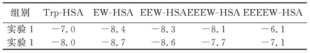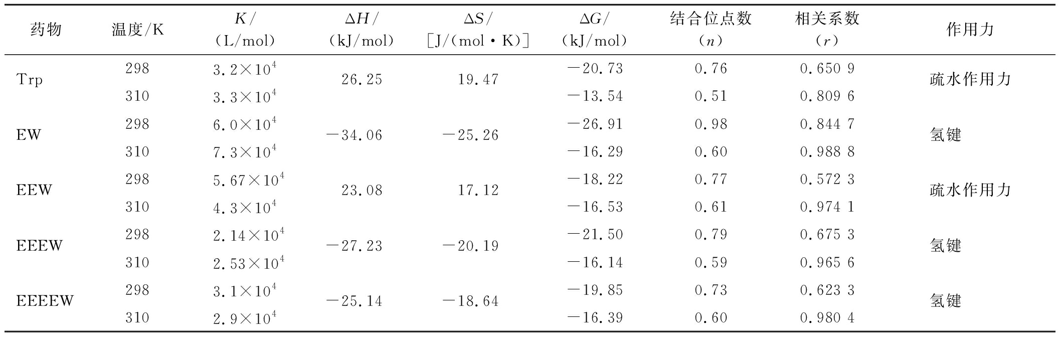通过计算得到了Trp、EW、EEW、EEEW、EEEEW与HSA之间的ΔH、ΔS和ΔG值,结果见表1。其中,ΔG<0表明反应自发进行。结合ΔH和ΔS的结果,可以确定,Trp-HSA和EEW-HSA之间的主要作用力是疏水作用力,EW-HSA、EEEW-HSA和EEEEW-HSA之间的主要作用力为氢键。