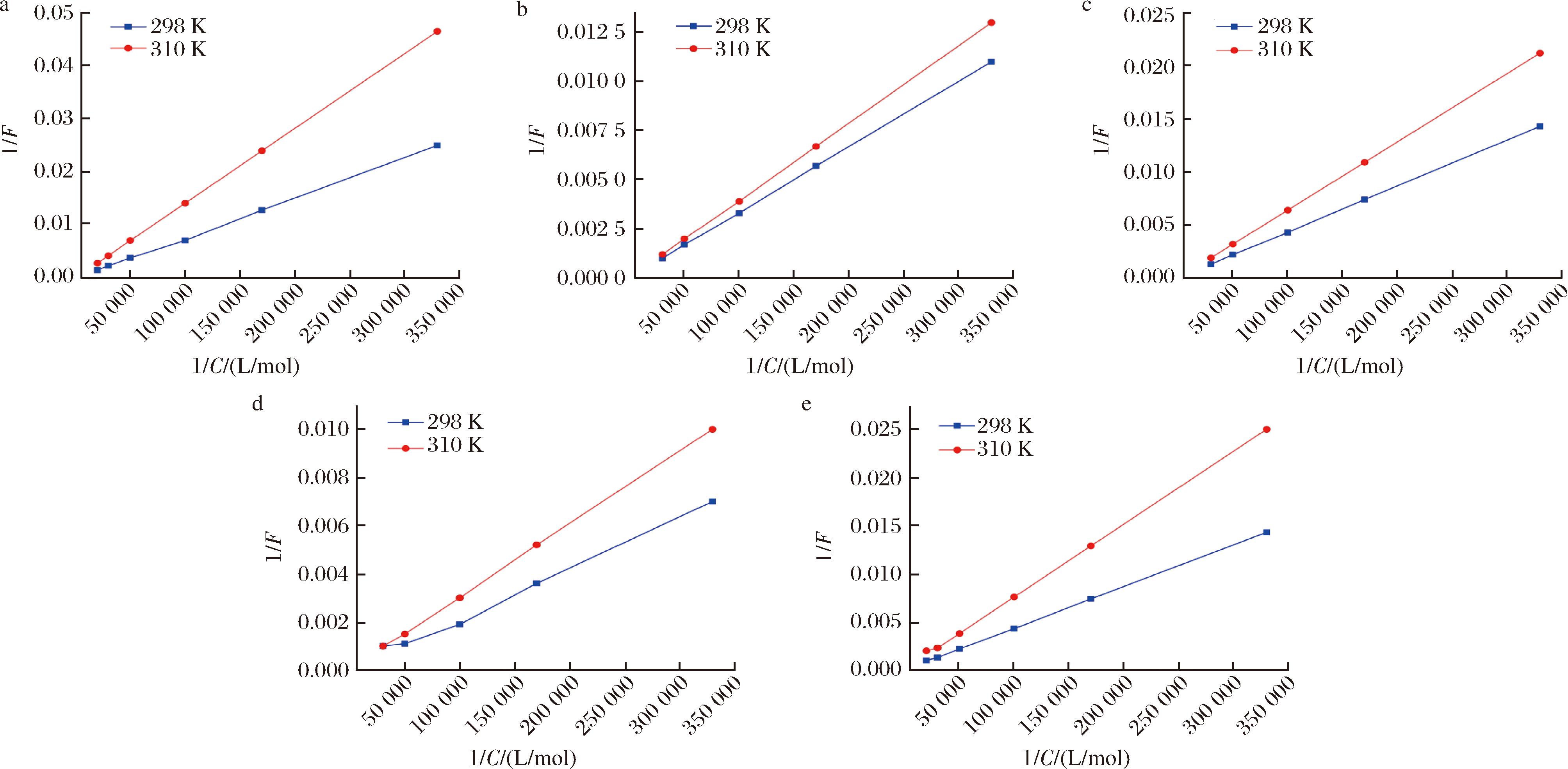 荧光光谱可测试配体小分子和受体蛋白的结合亲和力和结合作用力。HSA的荧光性质与其结构内的Trp、酪氨酸、苯丙氨酸残基密切相关。其中,Trp占据着至关重要的地位,是HSA内源性荧光的主要组成部分。HSA浓度不变,改变Trp、EW、EEW、EEEW、EEEEW浓度,在模拟人体生理条件下,得到Trp、EW、EEW、EEEW、EEEEW与HSA相互作用的荧光谱图。由图1可知,随药物浓度的增加,HSA的荧光强度逐渐增强,这表示Trp、EW、EEW、EEEW、EEEEW与HSA发生了相互作用,有发荧光的超分子化合物生成使荧光峰强度增强。Trp-HSA的最大发射峰从338.6 nm轻微红移到349.8 nm;EW-HSA的最大发射峰从311 nm轻微红移到314 nm;EEW-HSA的最大发射峰从311 nm轻微红移到313 nm;EEEW-HSA的最大发射峰从311 nm轻微红移到314.6 nm;EEEEW-HSA的最大发射峰从311 nm红移到314.1 nm。光谱的变化表明,Trp、EW、EEW、EEEW、EEEEW与HSA发生相互作用,诱导氨基酸残基周围微环境发生改变[19],导致疏水性降低但极性增加。相比而言,EW、EEW极性增加少,蛋白质空间构象比较稳定。