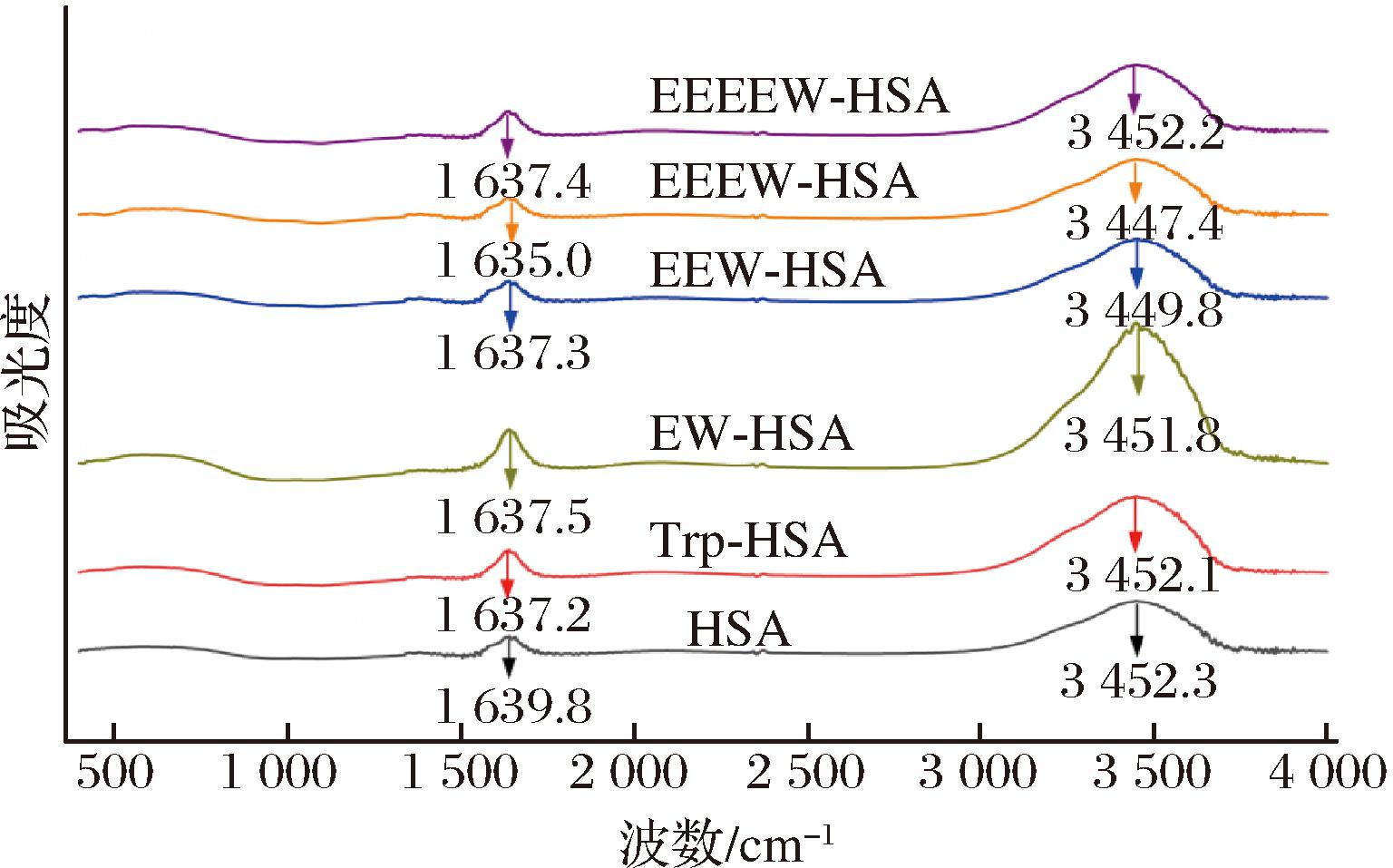 采用溶剂溶解成膜方法[15]。取冻干后的HSA及Trp、EW、EEW、EEEW、EEEEW与HSA的复合物(1 mg)进行1∶1(质量比)混合,pH值至7.4(Trp、EW、EEW、EEEW、EEEEW溶液1.0×10-4 mol/L、HSA溶液1.0×10-6 mol/L)。将烘干后的KBr装入玛瑙研钵碾磨粉末状,压片机压片,用棉签蘸取溶液涂在KBr薄片上,扫描波长为1 000~3 000 nm。使用Origin软件进行分析。