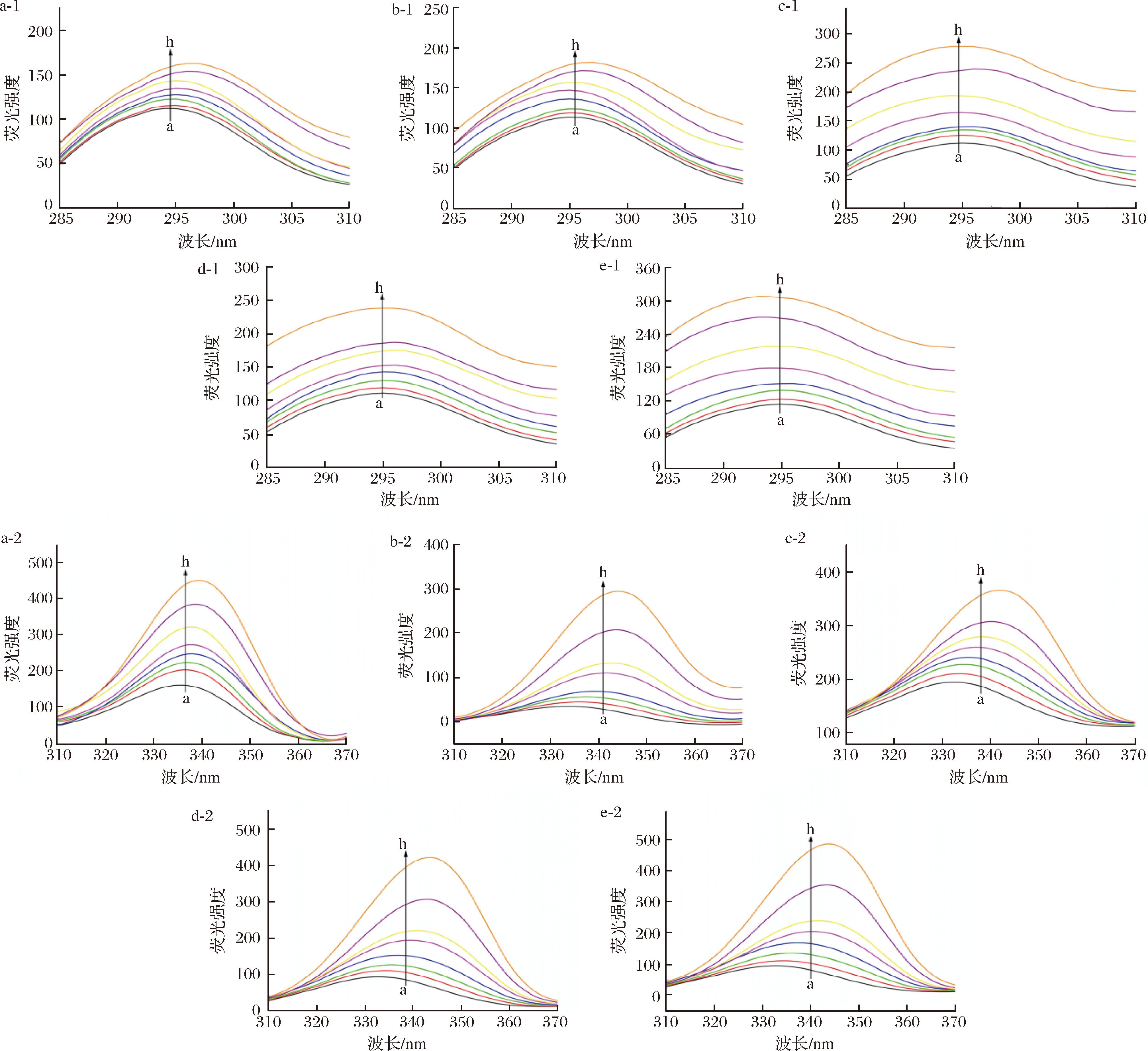 a-1~e-1-Δλ=15 nm时,Trp-HAS、EW-HAS、EEW-HAS、EEEW-HAS、EEEW-HSA;a-2~e-2-Δλ=60 nm时,Trp-HAS、EW-HAS、EEW-HAS、EEEW-HAS、EEEW-HSA