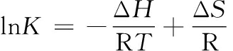 式中:ΔG为Gibbs自由能,kJ/mol;R为摩尔气体常数,8.314 J/(mol·K);T为绝对温度, K;ΔH为热力学参数焓变,kJ/mol;ΔS为热力学参数熵变,J/(mol·K)。