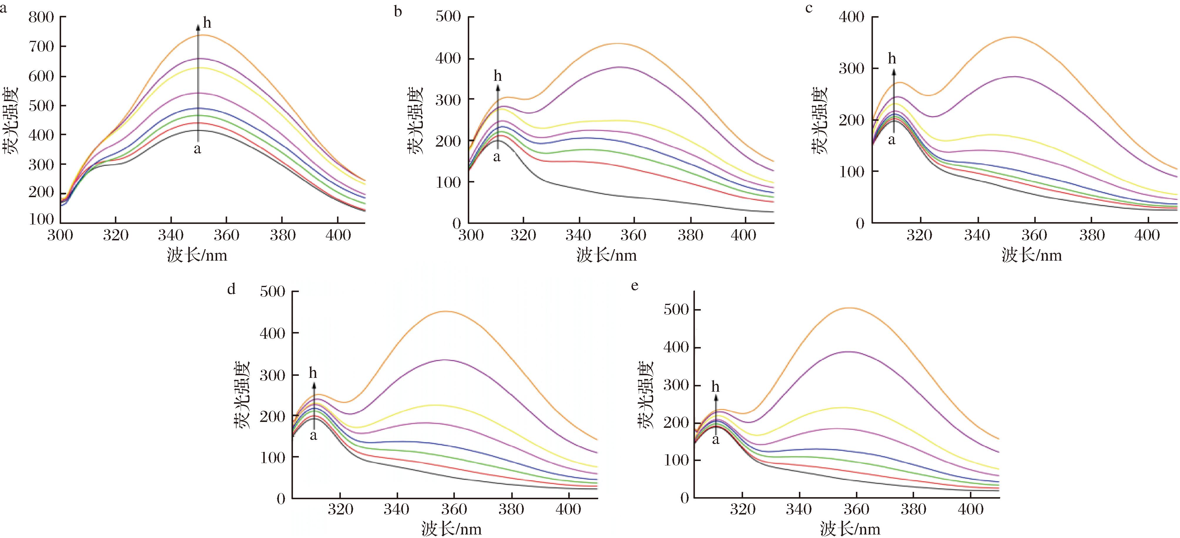注:CHSA=1.0×10-5 mol/L,CTrp、COEW从a~h分别为:0、0.3×10-5、0.6×10-5、1.0×10-5、2.0×10-5、3.0×10-5、5.0×10-5、7.0×10-5 mol/L。