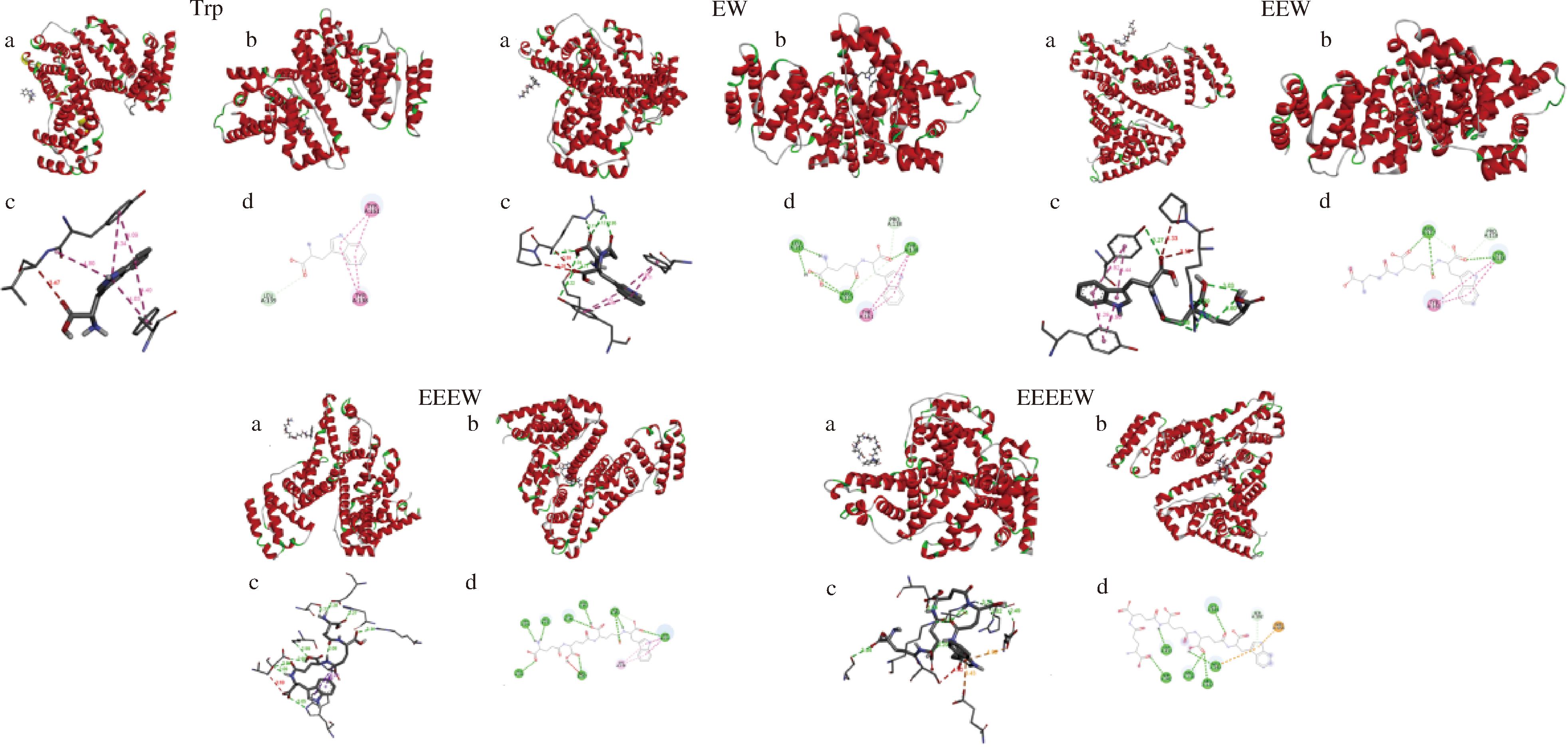 通过比较结合前后的结构,可以推断出Trp、EW、EEW、EEEW和EEEEW与HSA相互作用后,均引发了不同程度的构象变化。结合ZHAO等[25]的研究及对分子对接结果的分析,可以得出结论:Trp主要通过疏水作用力与HSA结合形成稳定复合物;EW、EEW及EEEW主要通过氢键和疏水作用力与HSA结合形成稳定复合物;EEEEW则主要通过氢键和静电作用力与HSA结合形成稳定复合物,该结论与热力学分析结果一致。其中Trp与HSA形成了4条疏水作用力,EW与HSA形成了4条疏水作用力和6条氢键,EEW与HSA形成了4条疏水作用力和3条氢键,EEEW与HSA形成了4条疏水作用力和9条氢键还有1条不利于结合的作用力,EEEEW与HSA形成了2条静电作用力和6条氢键,基于以上分析结果,不难发现在对接复合物中,EW、EEW与HSA的相互作用都优于Trp与HSA的相互作用,该结果与表2的打分结果是一致的。