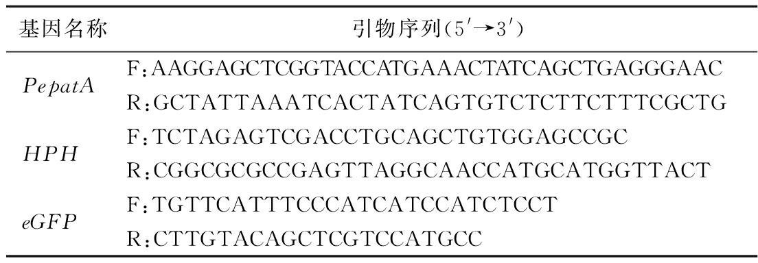 基因名称引物序列(5'→3')PepatAF:AAGGAGCTCGGTACCATGAAACTATCAGCTGAGGGAACR:GCTATTAAATCACTATCAGTGTCTCTTCTTTCGCTGHPHF:TCTAGAGTCGACCTGCAGCTGTGGAGCCGCR:CGGCGCGCCGAGTTAGGCAACCATGCATGGTTACTeGFPF:TGTTCATTTCCCATCATCCATCTCCTR:CTTGTACAGCTCGTCCATGCC