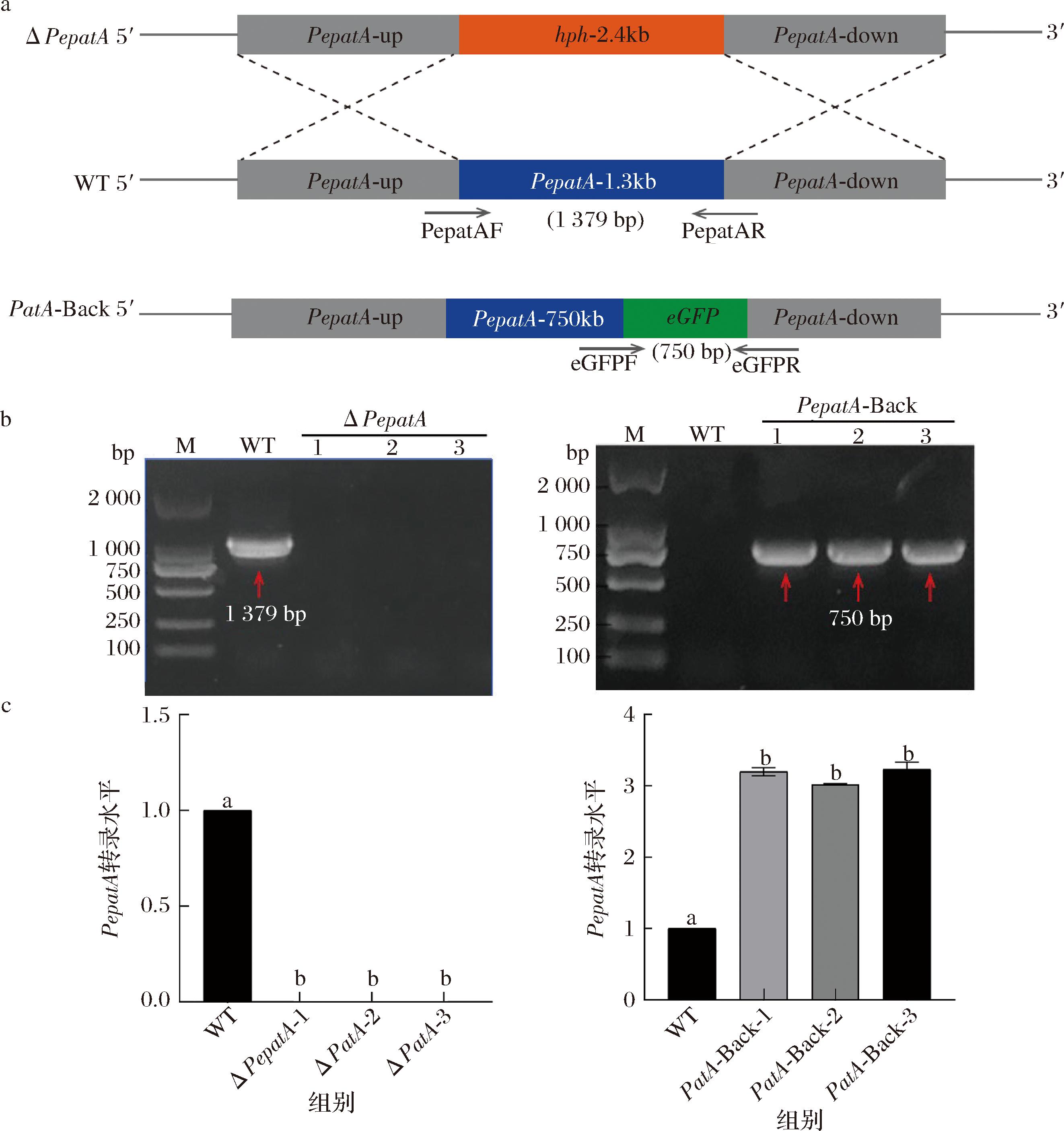 a-阳性转化子验证的引物位置示意图;b-PepatA缺失和回复突变株菌液PCR鉴定;c-缺失和回复突变株中PepatA转录水平的表达
