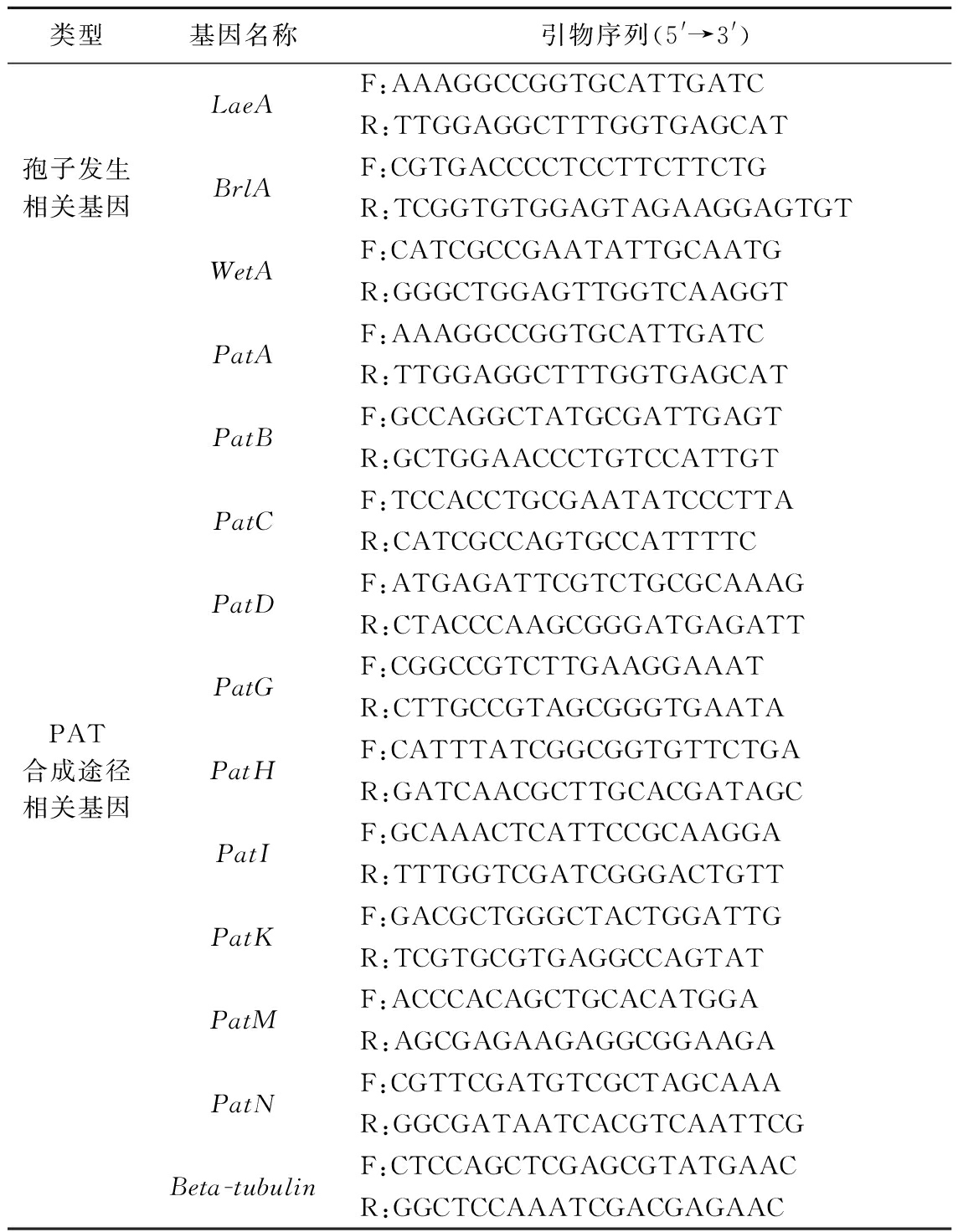 类型基因名称引物序列(5'→3')孢子发生相关基因LaeABrlAWetAF:AAAGGCCGGTGCATTGATCR:TTGGAGGCTTTGGTGAGCATF:CGTGACCCCTCCTTCTTCTGR:TCGGTGTGGAGTAGAAGGAGTGTF:CATCGCCGAATATTGCAATGR:GGGCTGGAGTTGGTCAAGGTPAT合成途径相关基因PatAPatBPatCPatDPatGPatHPatIPatKPatMPatNBeta-tubulinF:AAAGGCCGGTGCATTGATCR:TTGGAGGCTTTGGTGAGCATF:GCCAGGCTATGCGATTGAGTR:GCTGGAACCCTGTCCATTGTF:TCCACCTGCGAATATCCCTTAR:CATCGCCAGTGCCATTTTCF:ATGAGATTCGTCTGCGCAAAGR:CTACCCAAGCGGGATGAGATTF:CGGCCGTCTTGAAGGAAATR:CTTGCCGTAGCGGGTGAATAF:CATTTATCGGCGGTGTTCTGAR:GATCAACGCTTGCACGATAGCF:GCAAACTCATTCCGCAAGGAR:TTTGGTCGATCGGGACTGTTF:GACGCTGGGCTACTGGATTGR:TCGTGCGTGAGGCCAGTATF:ACCCACAGCTGCACATGGAR:AGCGAGAAGAGGCGGAAGAF:CGTTCGATGTCGCTAGCAAAR:GGCGATAATCACGTCAATTCGF:CTCCAGCTCGAGCGTATGAACR:GGCTCCAAATCGACGAGAAC