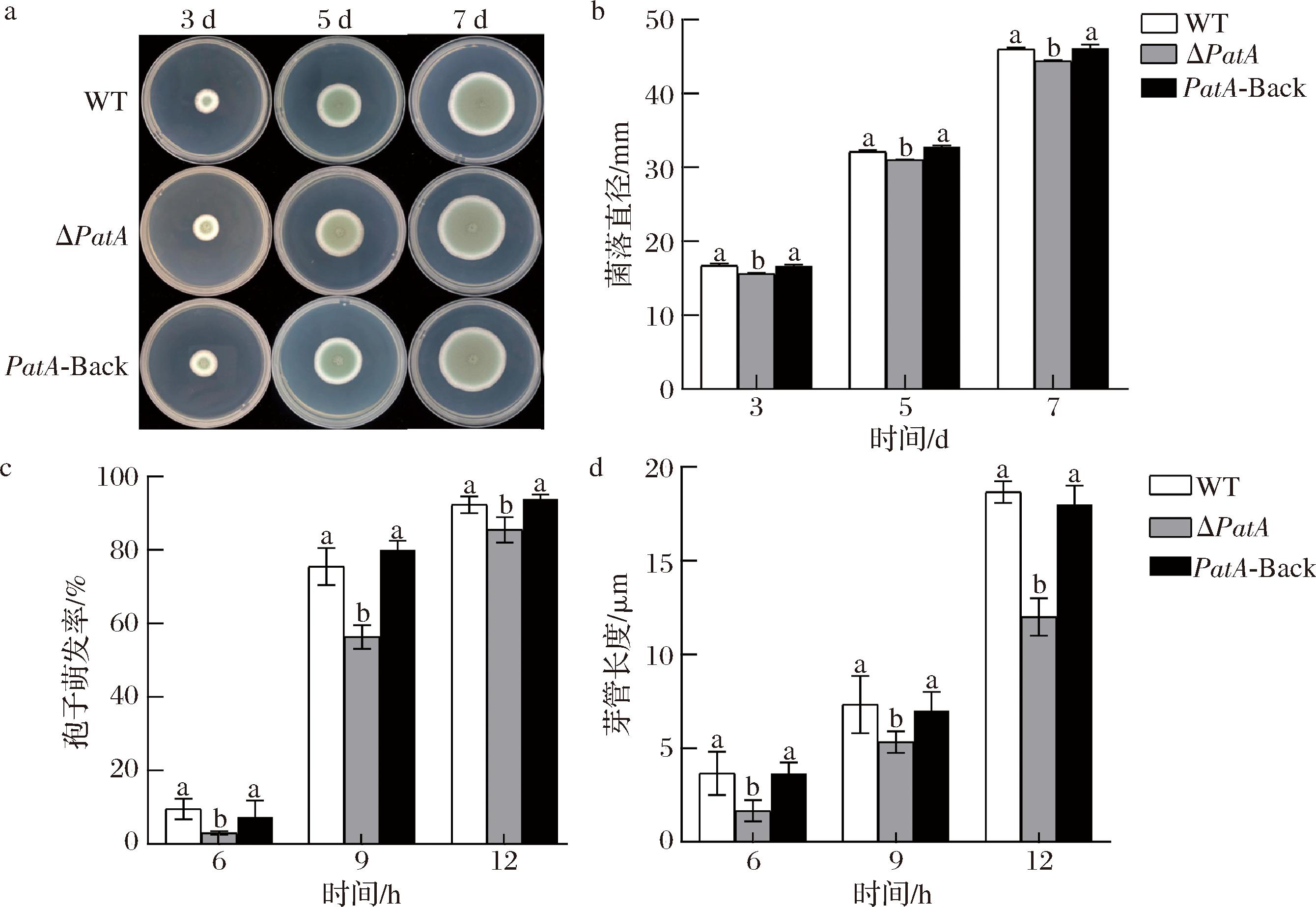 将PepatA缺失、回复和野生型菌株的分生孢子分别接种于CYA培养基中25 ℃避光培养7 d,观察菌落形态和生长情况。结果显示,PepatA缺失、回复突变菌株的菌落形态与野生型的基本一致,无明显差别;与野生型相比,PepatA缺失菌株的菌落直径明显减小,孢子萌发率和芽管长度均显著下降;PepatA回复菌株的菌落直径、萌发率和芽管长度无显著差异(图2)。结果表明将PepatA缺失后,P.expansum的孢子在一定程度上萌发滞后。