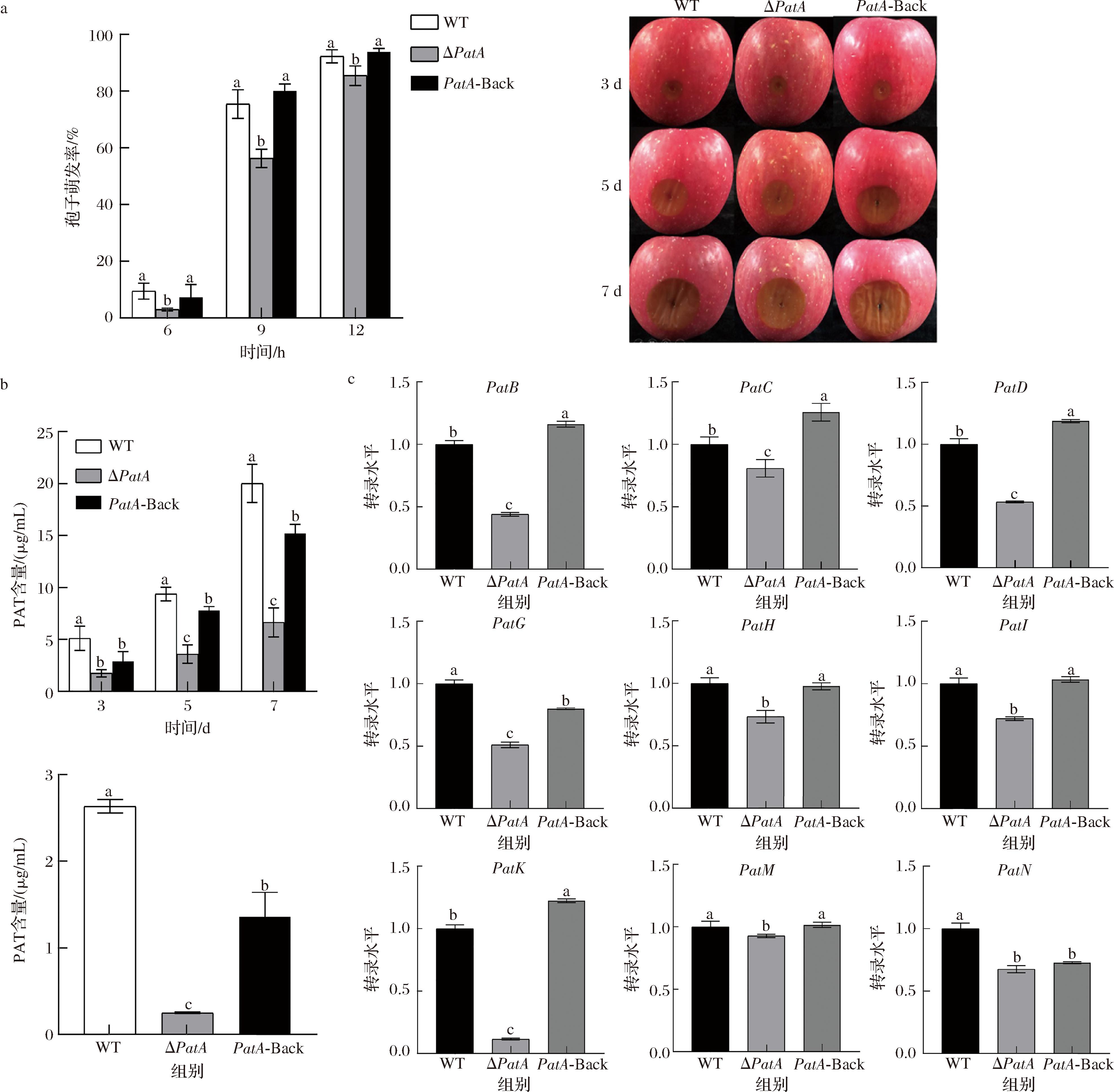 a-孢子萌发率和病斑形态;b-苹果组织及培养基中PAT含量;c-PAT合成相关基因的转录水平表达
