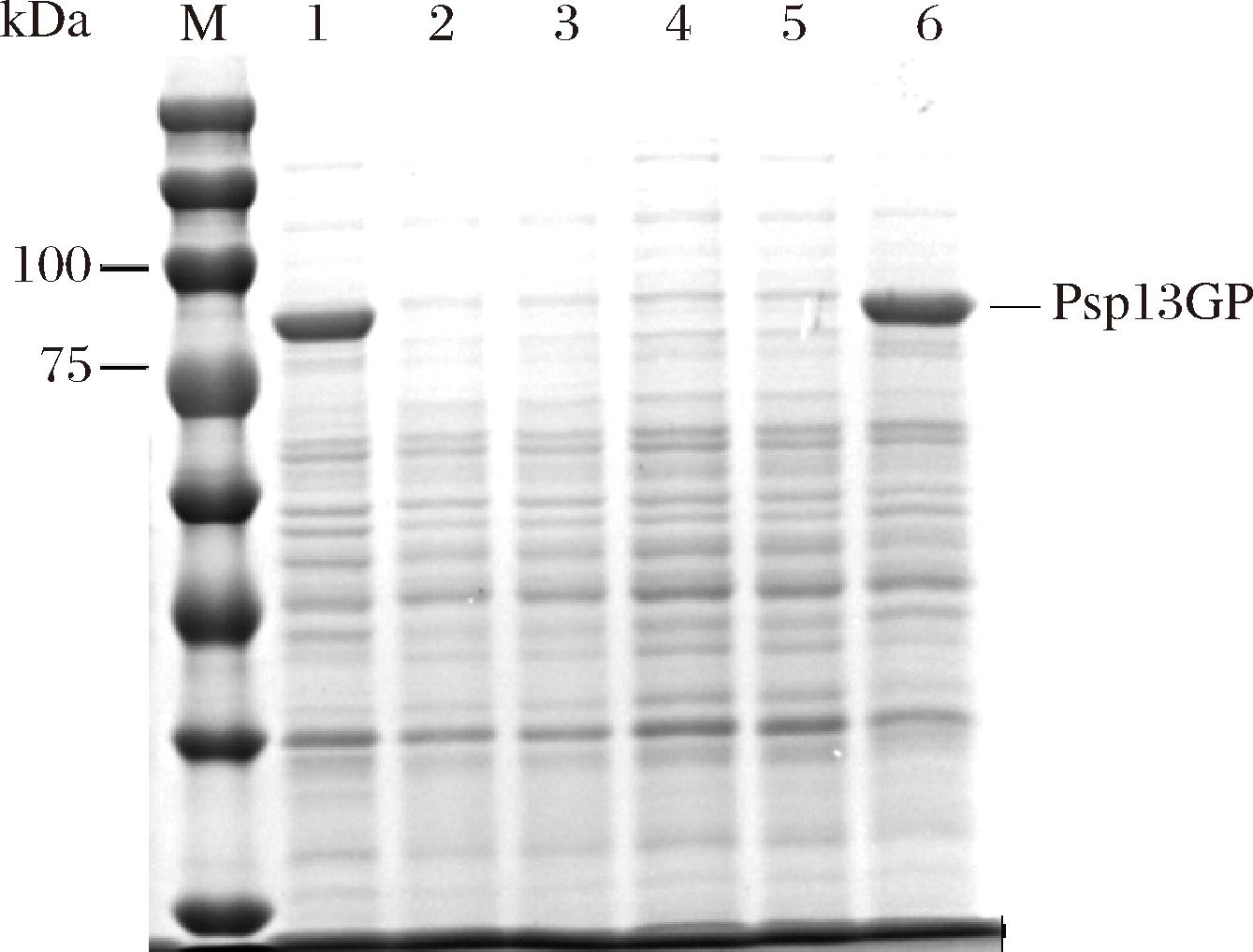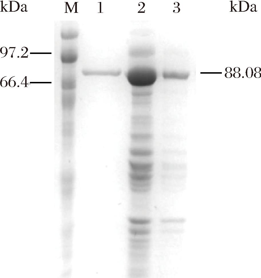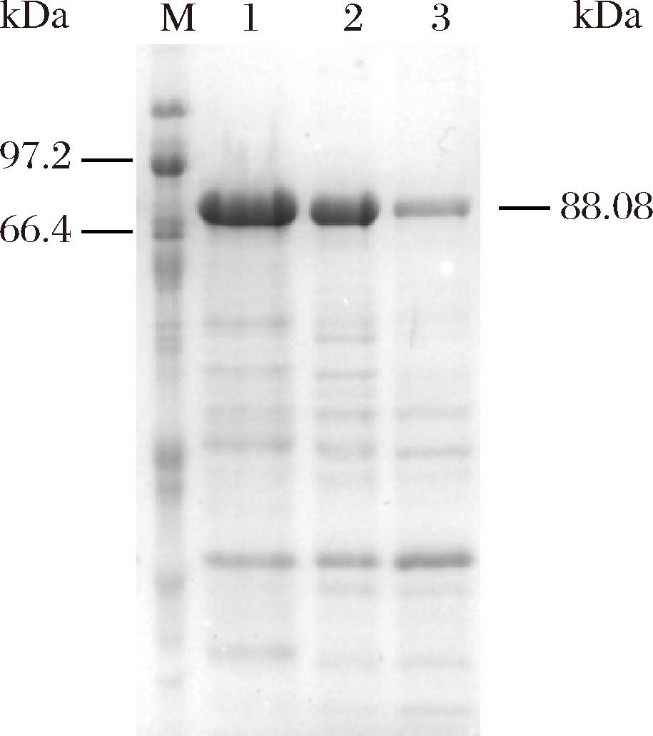 将获得的重组菌E.coli BL21(DE3)/pET-24a(+)-Psp13GP进行摇瓶发酵,对发酵上清液、破壁上清液、破壁沉淀进行SDS-PAGE分析,Psp13GP的理论分子质量为88.08 kDa。如图1所示,在理论分子质量附近有清晰的条带,其表达大部分位于泳道2的破壁上清液中,且测得酶活力为7.70 U/mL,Psp13GP在E.coli BL21(DE3)中成功重组表达且为胞内酶。