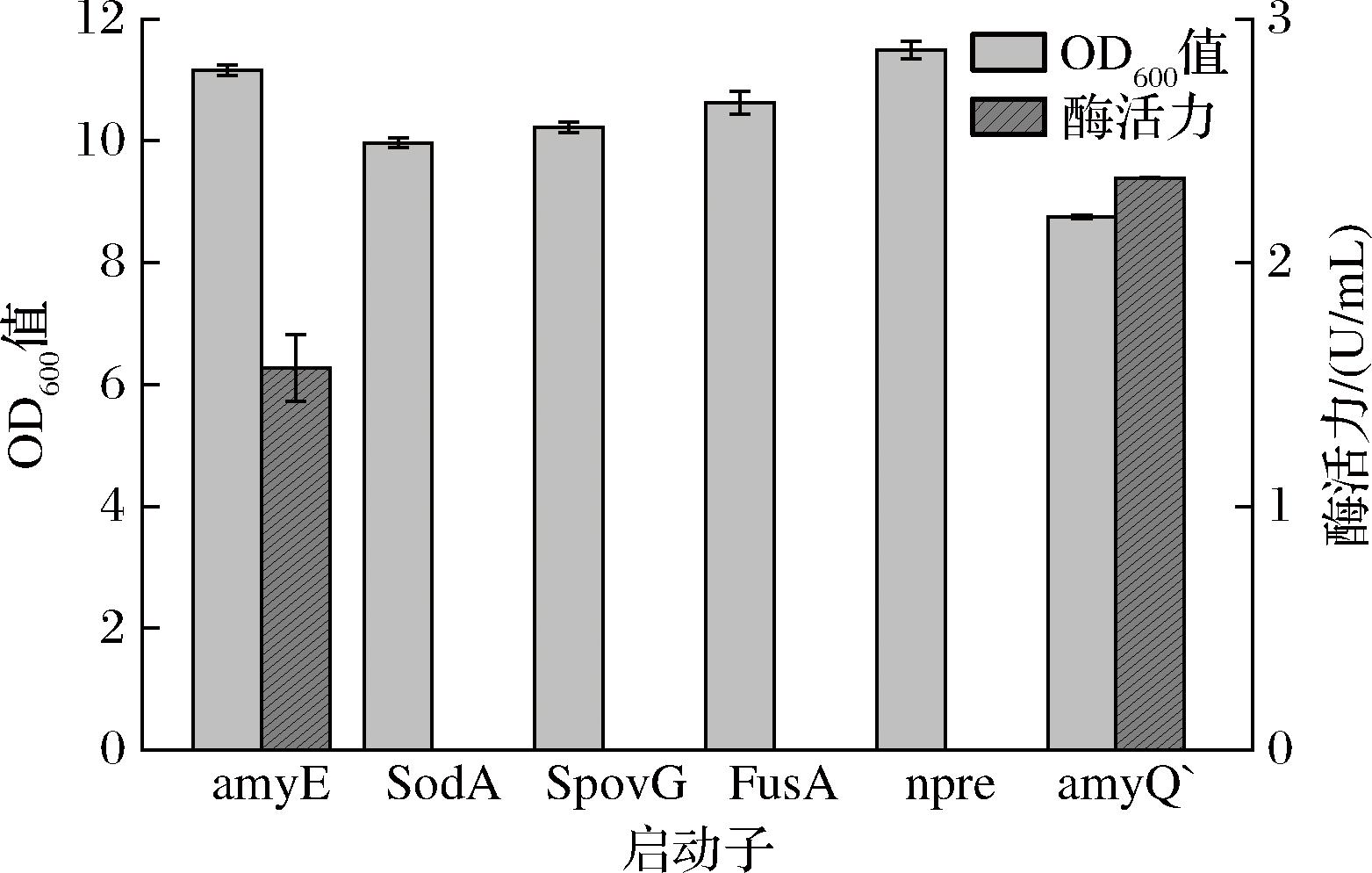 图5 含不同单启动子重组菌的摇瓶发酵情况酶活力及生长情况