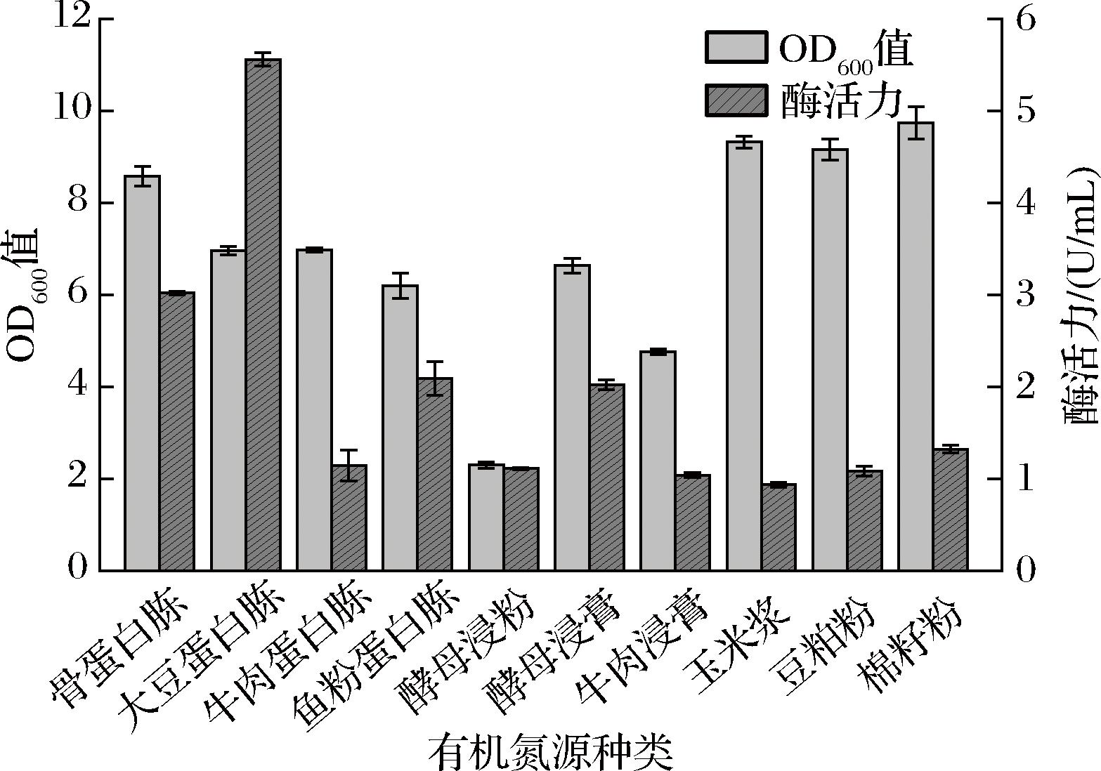 图6 单一氮源种类对重组菌生长和产酶的影响