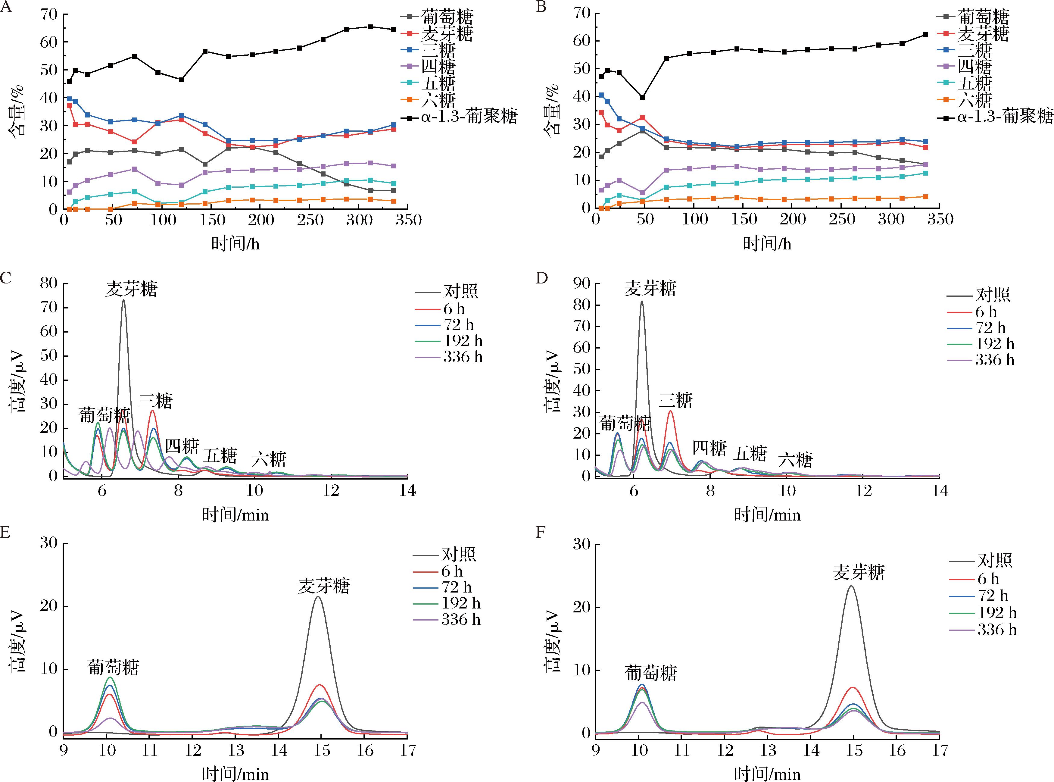 结果如图3所示,当磷酸盐终浓度为20 mmol/L时,α-1,3-葡聚糖最终产率为62.02%(图3-A);当磷酸盐浓度为50 mmol/L时,α-1,3-葡聚糖最终产率为59.91%(图3-B);在低磷酸盐浓度条件下α-1,3-葡聚糖产率较高,且反应72 h时,α-1,3-葡聚糖产率均高于50%,此后反应主要为各组分之间的转化(图3-C~图3-D)。如图3-E~图3-F所示,反应过程中无黑曲霉二糖生成,产物为以麦芽糖为基础以α-1,3糖苷键链接的葡聚糖。