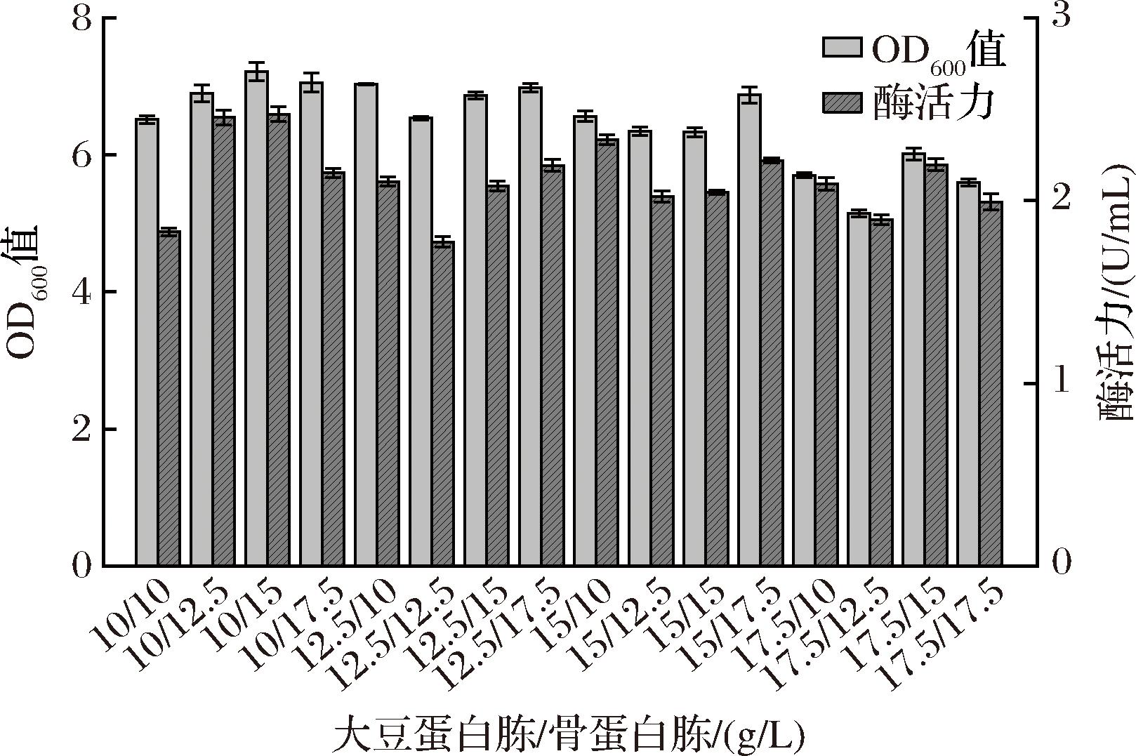 根据单一有机氮源种类及浓度优化结果,选取大豆蛋白胨和骨蛋白胨分别以质量浓度10、12.5、15、17.5 g/L组合进行复合氮源优化,生长情况与胞内酶活力如图8所示。当大豆蛋白胨质量浓度为10 g/L、骨蛋白胨质量浓度为15 g/L时,重组菌酶活力最高为2.22 U/mL,低于两者作为单一氮源时的最高酶活力,因此选取10 g/L大豆蛋白胨作为氮源进行后续培养基优化。