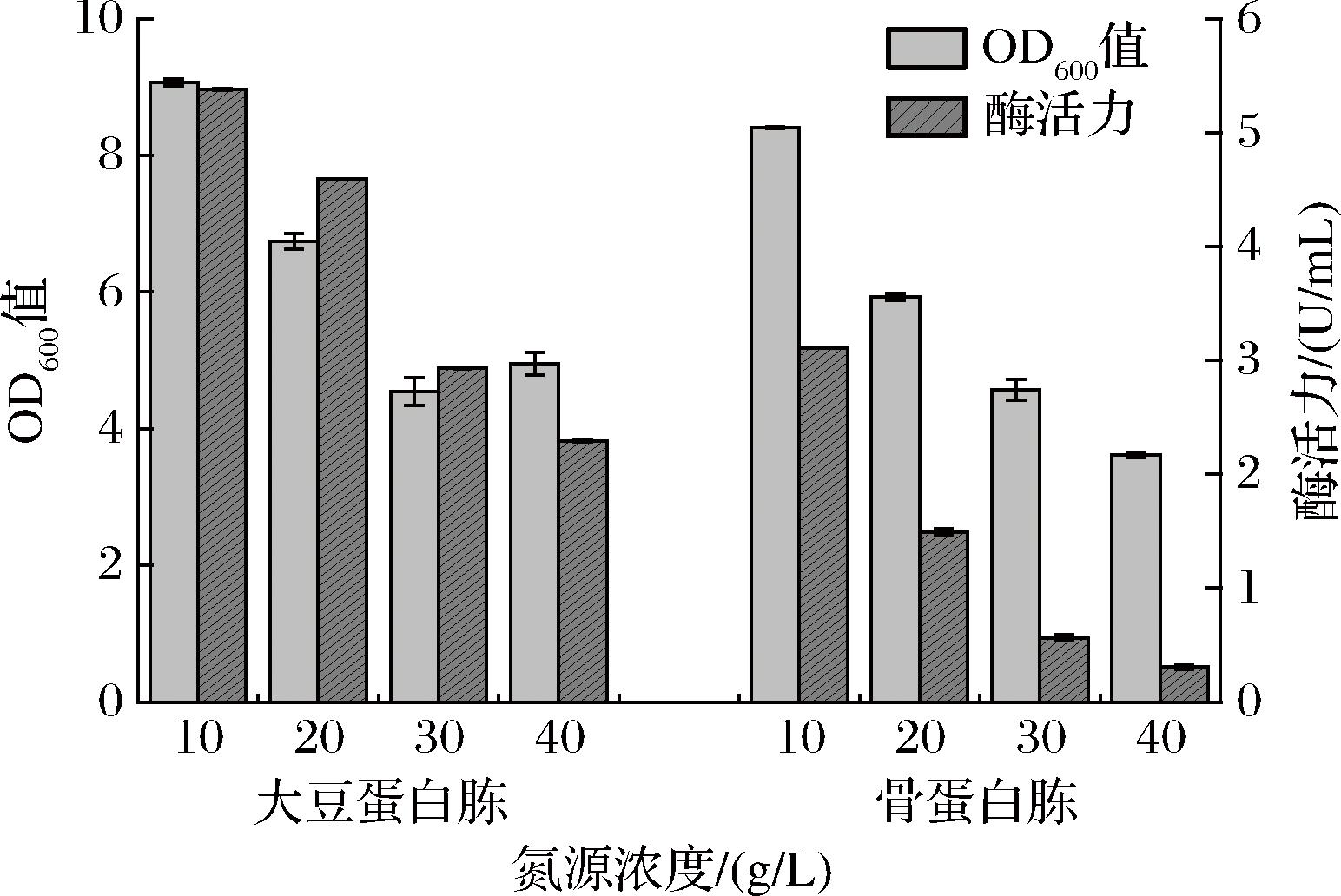 根据单一氮源种类优化结果,选取大豆蛋白胨和骨蛋白胨以质量浓度为10、20、30、40 g/L进行单一氮源浓度优化,生长情况与胞内酶活力如图7所示。当以大豆蛋白胨作为单一氮源,质量浓度10 g/L时重组菌酶活力最高,为5.38 U/mL;以骨蛋白胨作为单一氮源,质量浓度10 g/L时重组酶活力最高,为3.11 U/mL。