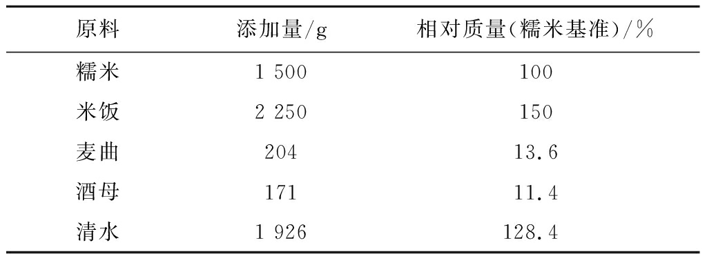 原料添加量/g相对质量(糯米基准)/%糯米1 500100米饭2 250150麦曲20413.6酒母17111.4清水1 926128.4