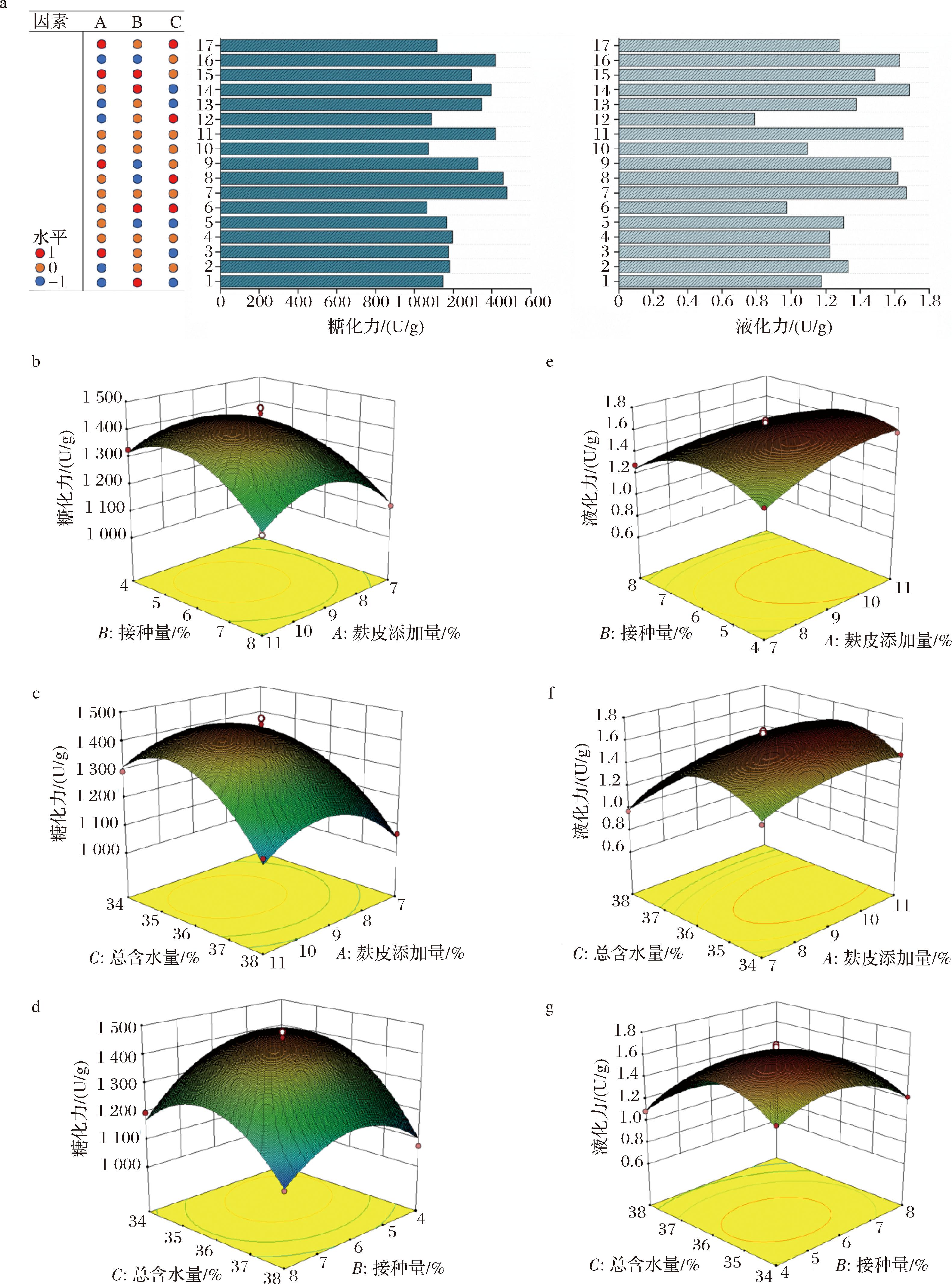 a-Plackett-Burman试验组合设计及结果;b~g-麸皮添加量、接种量、总含水量对块曲糖化、液化力的等高线图