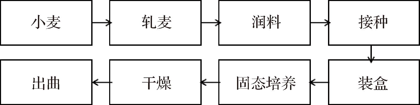 块曲的制作流程:在实验室进行手工块曲的制作,其工艺流程如图1所示,工艺控制参数参考周志立等[13]的方法并根据预实验略有修改[14]。按照表1所述参数在培养箱中对块曲进行发酵。