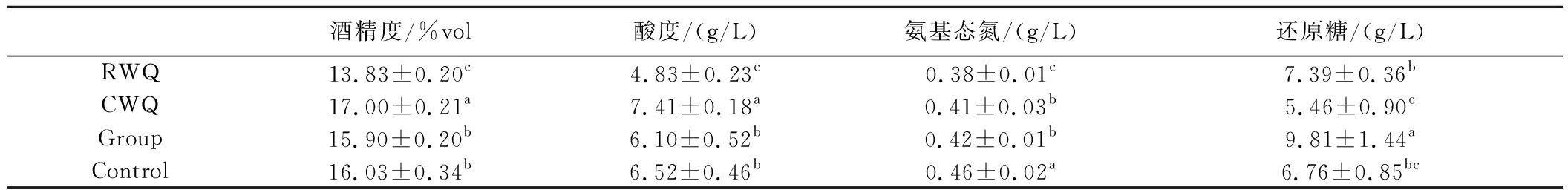 酒精度/%vol酸度/(g/L)氨基态氮/(g/L)还原糖/(g/L)RWQ13.83±0.20c4.83±0.23c0.38±0.01c7.39±0.36bCWQ17.00±0.21a7.41±0.18a0.41±0.03b5.46±0.90cGroup15.90±0.20b6.10±0.52b0.42±0.01b9.81±1.44aControl16.03±0.34b6.52±0.46b0.46±0.02a6.76±0.85bc