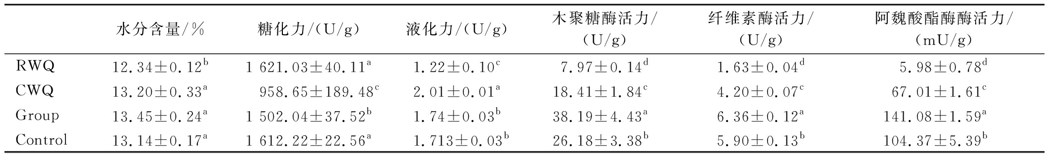 水分含量/%糖化力/(U/g)液化力/(U/g)木聚糖酶活力/(U/g)纤维素酶活力/(U/g)阿魏酸酯酶酶活力/(mU/g)RWQ12.34±0.12b1 621.03±40.11a1.22±0.10c7.97±0.14d1.63±0.04d5.98±0.78dCWQ13.20±0.33a958.65±189.48c2.01±0.01a18.41±1.84c4.20±0.07c67.01±1.61cGroup13.45±0.24a1 502.04±37.52b1.74±0.03b38.19±4.43a6.36±0.12a141.08±1.59aControl13.14±0.17a1 612.22±22.56a1.713±0.03b26.18±3.38b5.90±0.13b104.37±5.39b