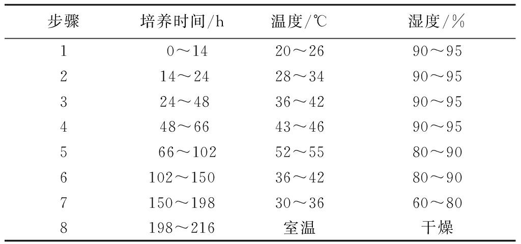 步骤培养时间/h温度/℃湿度/%1 0~1420~2690~952 14~2428~3490~953 24~4836~4290~954 48~6643~4690~955 66~10252~5580~906102~15036~4280~907150~19830~3660~808198~216室温干燥