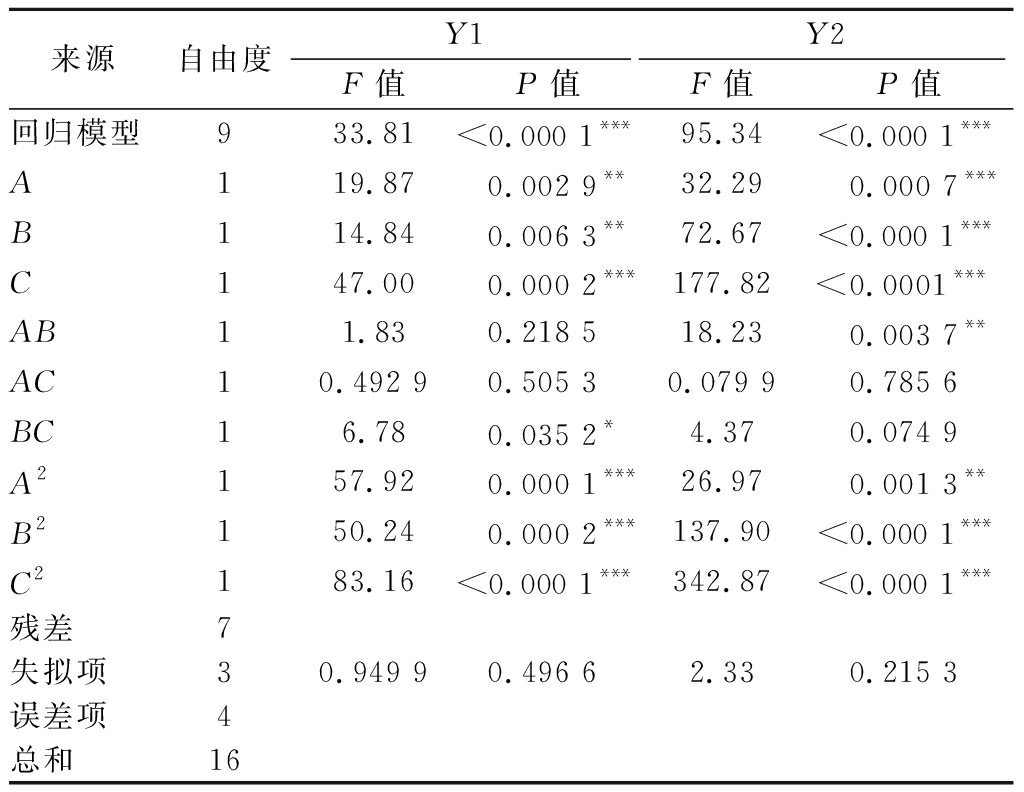 来源自由度Y1Y2F值P值F值P值回归模型933.81<0.000 1***95.34<0.000 1***A119.870.002 9**32.290.000 7***B114.840.006 3**72.67<0.000 1***C147.000.000 2***177.82<0.0001***AB11.830.218 518.230.003 7**AC10.492 90.505 30.079 90.785 6BC16.780.035 2*4.370.074 9A2157.920.000 1***26.970.001 3**B2150.240.000 2***137.90<0.000 1***C2183.16<0.000 1***342.87<0.000 1***残差7失拟项30.949 90.496 62.330.215 3误差项4总和16