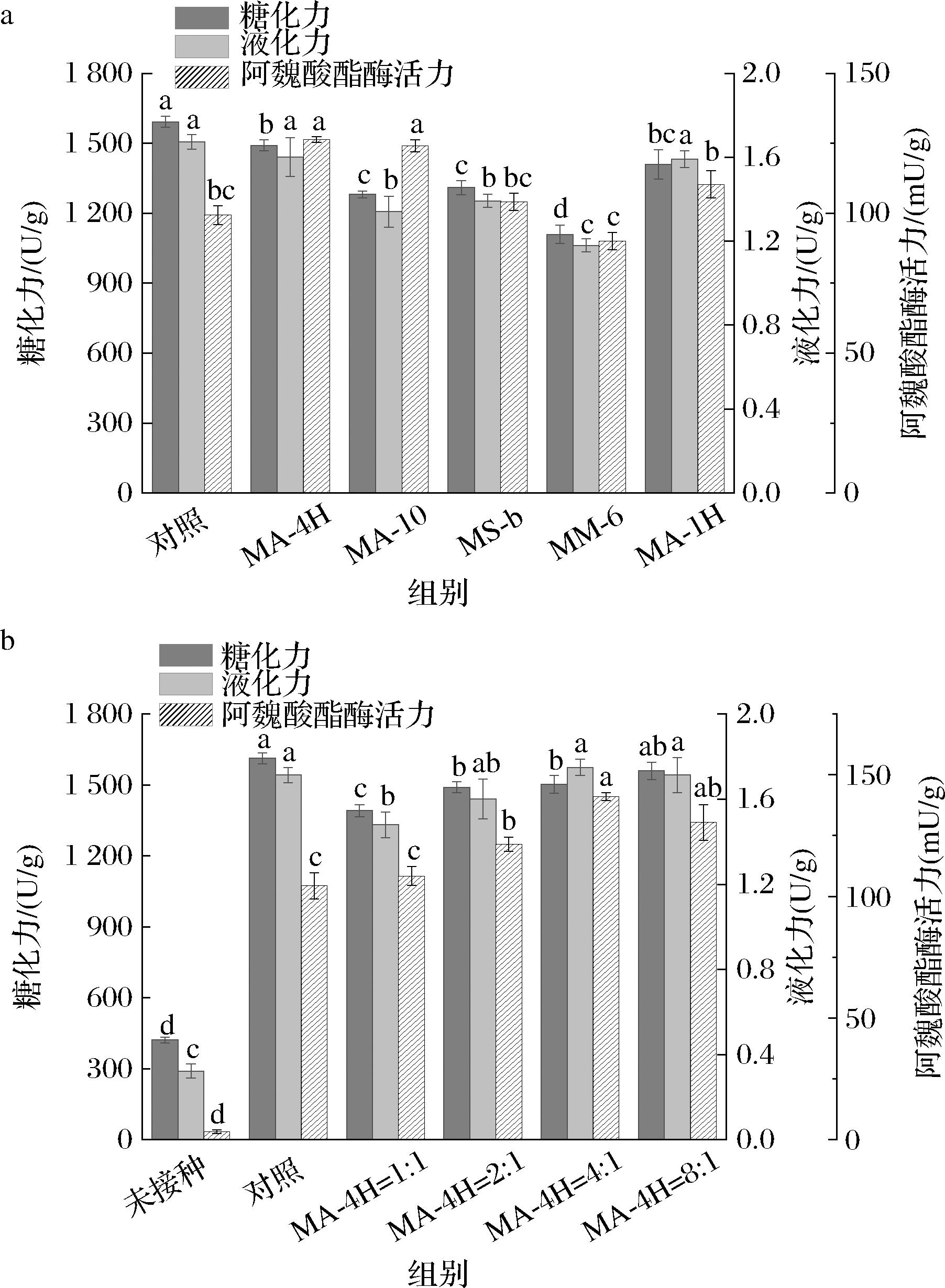 首先,将草酸青霉菌与筛选菌株的接种体积比调整为2∶1(总接种量为6%)制备块曲,由图5-a可知,块曲糖化和液化力均有一定程度的降低。与只接种草酸青霉菌M1816(对照组)制备的块曲相比,MM-6、MA-10和MS-b的糖化和液化力显著降低,MA-4H和MA-1H 3组间的液化力无显著差异(P>0.05)。然而,MA-4H和MA-10的阿魏酸酯酶活力显著高于对照组。因此,选择菌株A-4H作为生物强化剂和草酸青霉菌M1816制备块曲,并对接种比例进行优化。