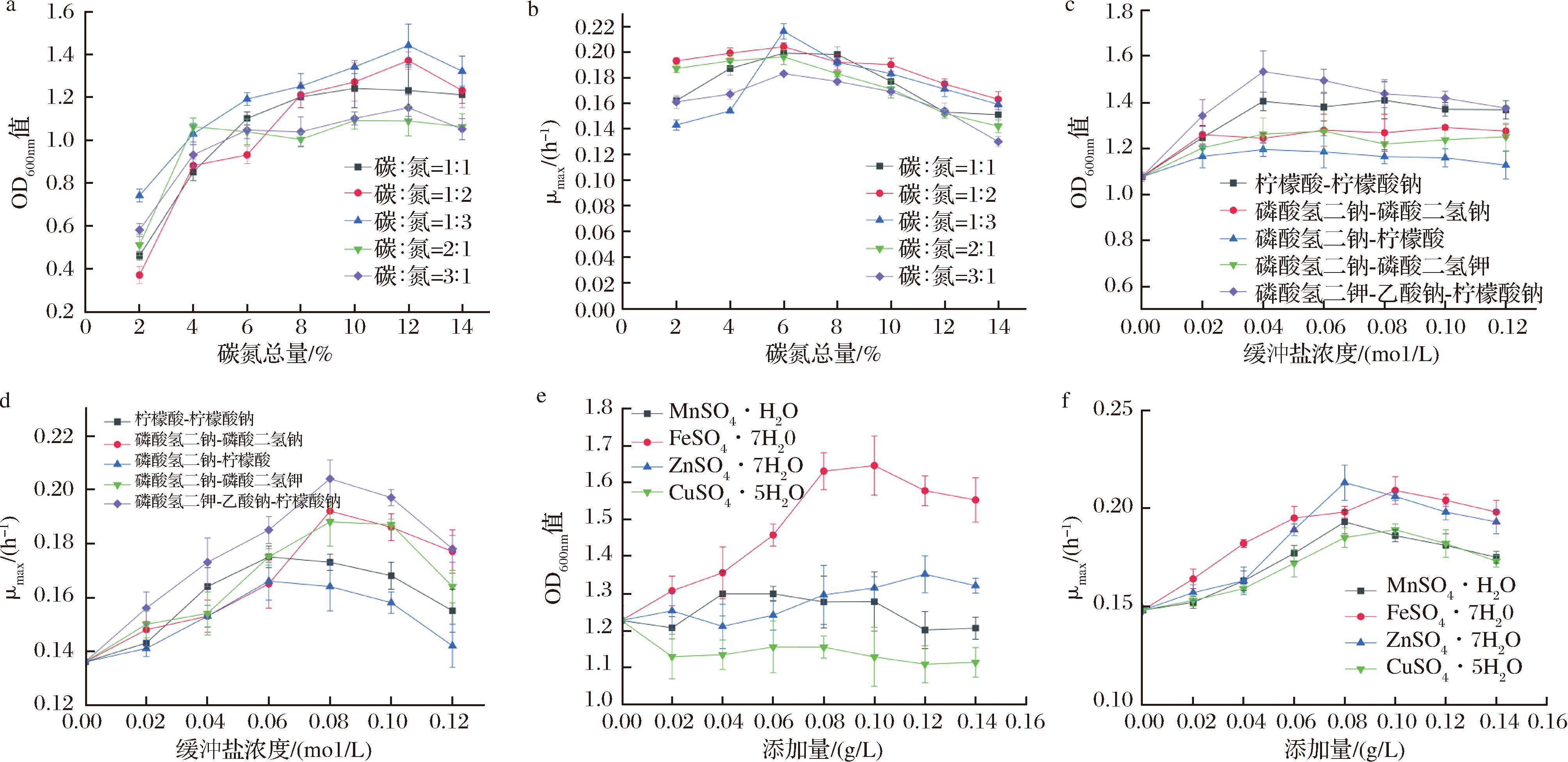 a-不同碳氮源总含量及比例对菌株菌体密度的影响;b-不同碳氮源总含量及比例对菌株最大比生长率的影响;c-不同缓冲盐体系对菌株菌体密度的影响;d-不同缓冲盐体系对菌株最大比生长率的影响;e-不同无机盐对菌株菌体密度的影响;f-不同无机盐对菌株最大比生长率的影响