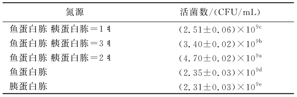 氮源活菌数/(CFU/mL)鱼蛋白胨∶胰蛋白胨=1∶1(2.51±0.06)×109c鱼蛋白胨∶胰蛋白胨=3∶1(3.40±0.02)×109b鱼蛋白胨∶胰蛋白胨=2∶1(4.70±0.02)×109a鱼蛋白胨(2.35±0.03)×109d胰蛋白胨(2.31±0.03)×109e
