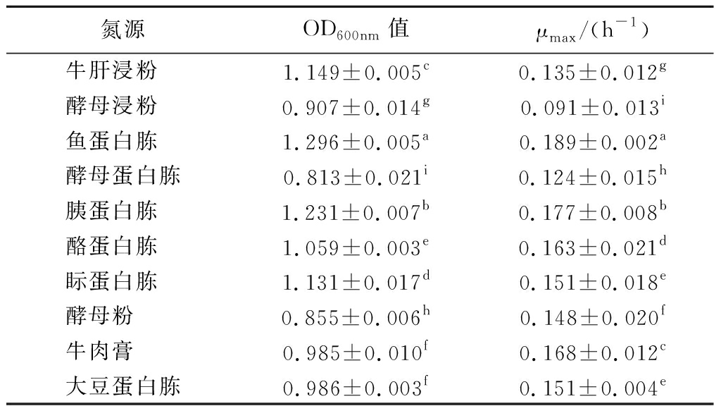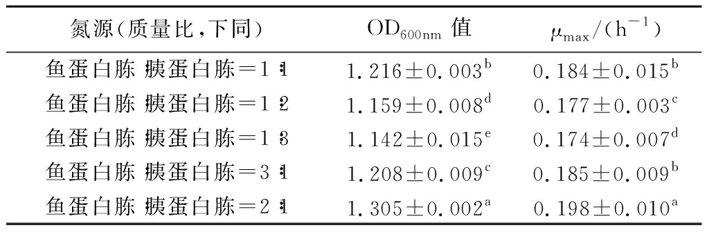 氮源(质量比,下同)OD600nm值μmax/(h-1)鱼蛋白胨∶胰蛋白胨=1∶11.216±0.003b0.184±0.015b鱼蛋白胨∶胰蛋白胨=1∶21.159±0.008d0.177±0.003c鱼蛋白胨∶胰蛋白胨=1∶31.142±0.015e0.174±0.007d鱼蛋白胨∶胰蛋白胨=3∶11.208±0.009c0.185±0.009b鱼蛋白胨∶胰蛋白胨=2∶11.305±0.002a0.198±0.010a