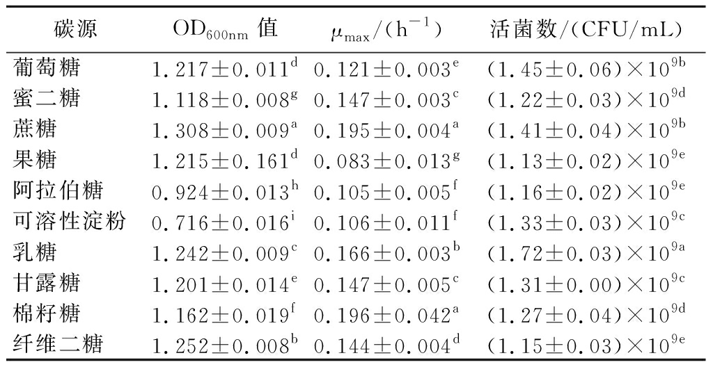 碳源OD600nm值μmax/(h-1)活菌数/(CFU/mL)葡萄糖1.217±0.011d0.121±0.003e(1.45±0.06)×109b蜜二糖1.118±0.008g0.147±0.003c(1.22±0.03)×109d蔗糖1.308±0.009a0.195±0.004a(1.41±0.04)×109b果糖1.215±0.161d0.083±0.013g(1.13±0.02)×109e阿拉伯糖0.924±0.013h0.105±0.005f(1.16±0.02)×109e可溶性淀粉0.716±0.016i0.106±0.011f(1.33±0.03)×109c乳糖1.242±0.009c0.166±0.003b(1.72±0.03)×109a甘露糖1.201±0.014e0.147±0.005c(1.31±0.00)×109c棉籽糖1.162±0.019f0.196±0.042a(1.27±0.04)×109d纤维二糖1.252±0.008b0.144±0.004d(1.15±0.03)×109e