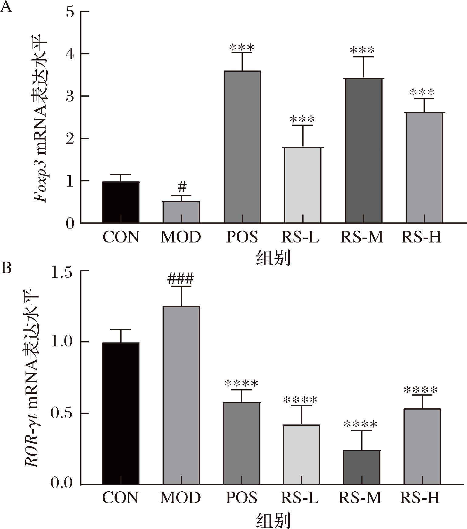 图9 山药抗性淀粉对溃疡性结肠炎小鼠结肠组织中ROR-γt和Foxp3 mRNA表达的影响