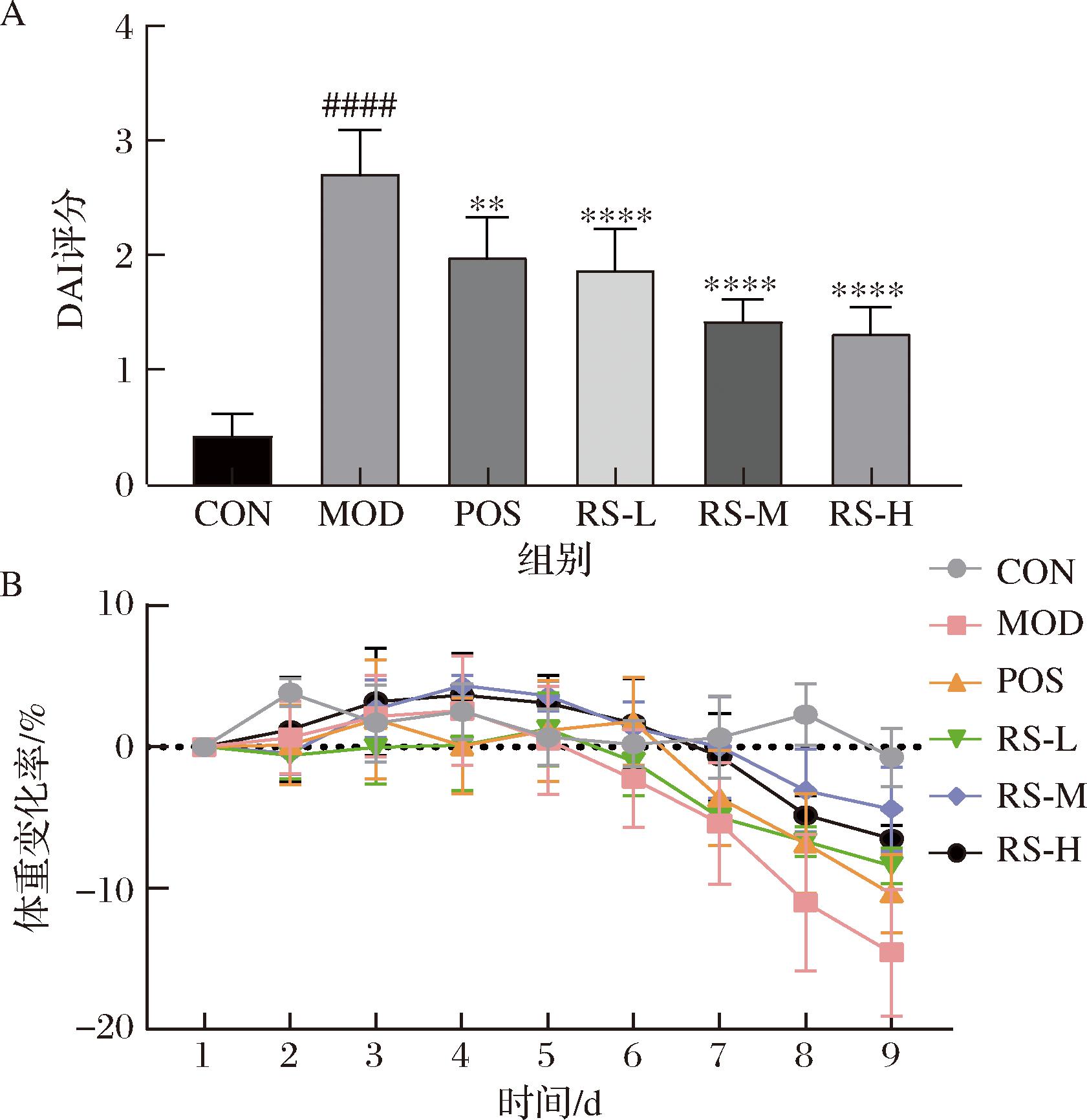 注:与CON组相比,####P<0.000 1;与DSS组相比,**P<0.01,****P<0.000 1。