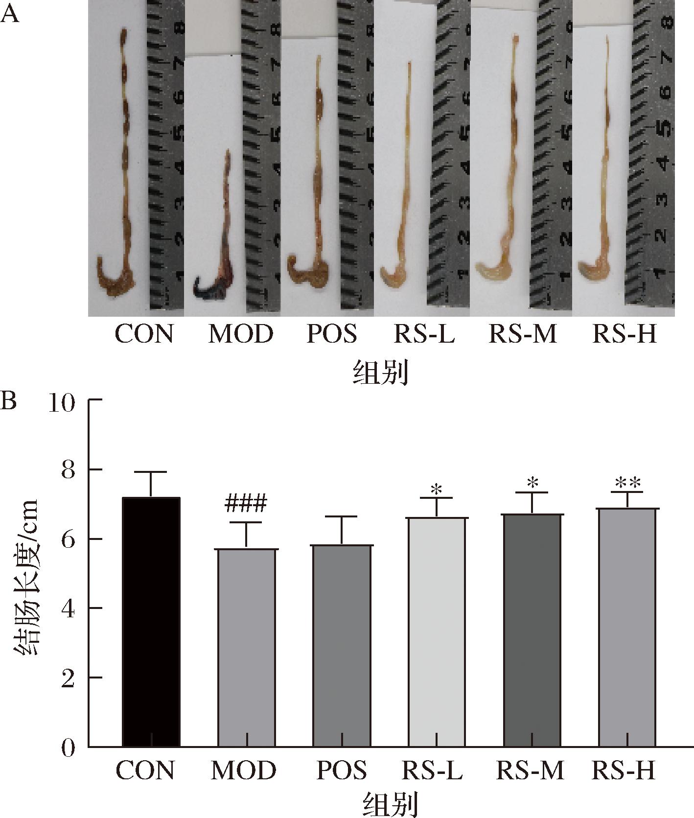 A-结肠组织;B-结肠长度
