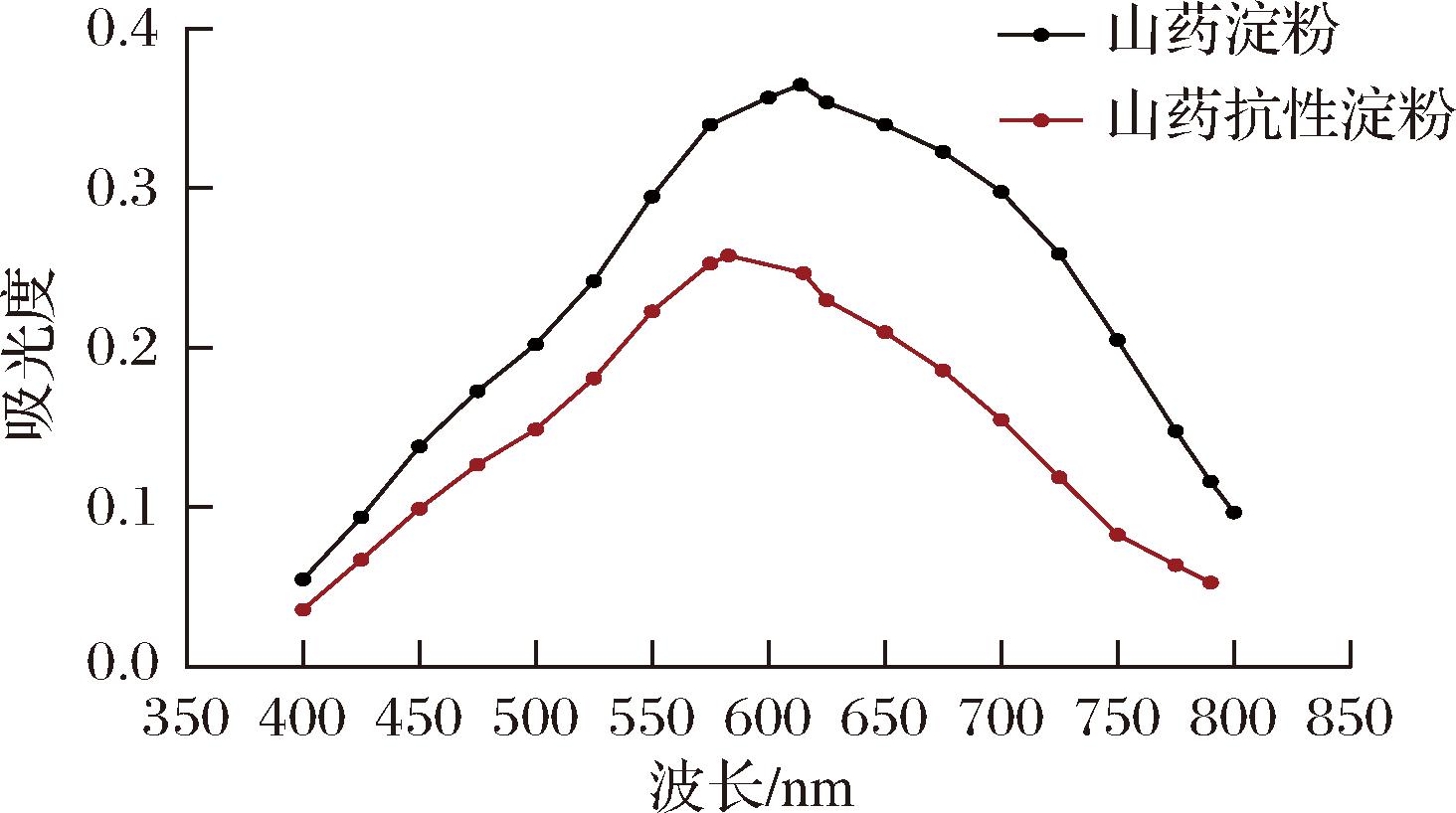 碘与直链淀粉结合形成蓝色络合物的最大吸收峰为600~640 nm,与支链淀粉结合形成紫红色复合物最大吸收峰为520~560 nm;吸收峰的位置和强度反映碘-碳化学键信息,可用于直/支链淀粉比例及分子质量大小的鉴别。山药抗性淀粉碘吸收曲线见图2,其最大吸收峰为585 nm,表明以直链为主;最大吸收峰较淀粉碘曲线左移,表明在提取过程中直链淀粉和支链淀粉的比例发生了变化。