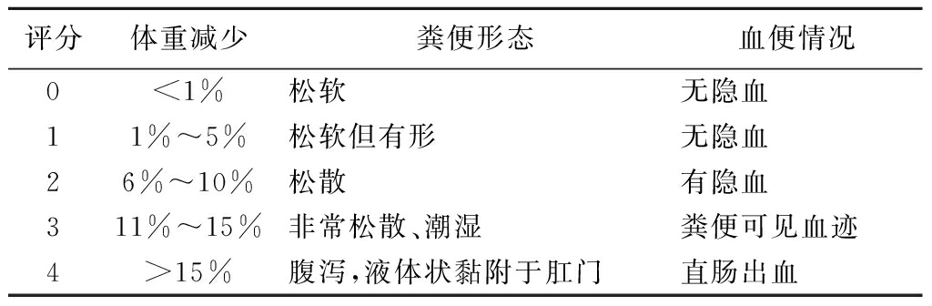 评分体重减少粪便形态血便情况0<1%松软无隐血11%~5%松软但有形无隐血26%~10%松散有隐血311%~15%非常松散、潮湿粪便可见血迹4>15%腹泻,液体状黏附于肛门直肠出血