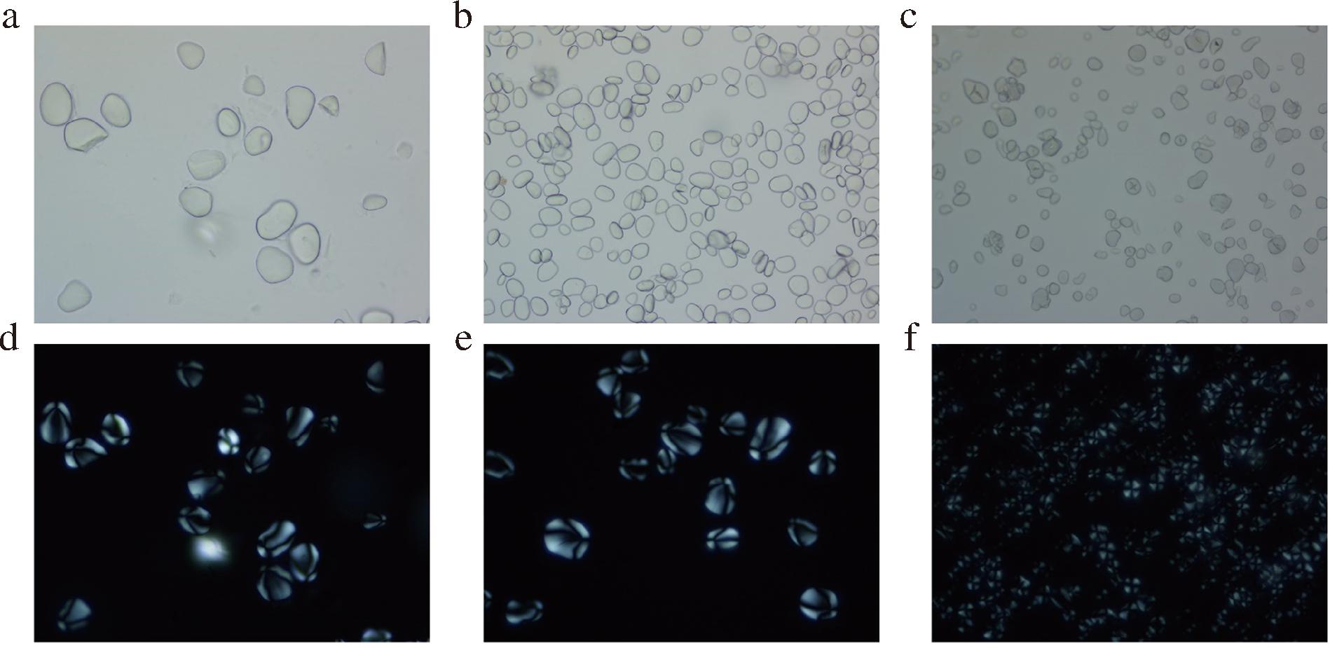 a~c分别为山药粉、山药淀粉和山药抗性淀粉的光学显微镜图;d~f分别为山药粉、山药淀粉和山药抗性淀粉的双折射模式图