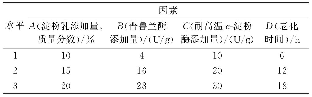 水平因素A(淀粉乳添加量,质量分数)/%B(普鲁兰酶添加量)/(U/g)C(耐高温α-淀粉酶添加量)/(U/g)D(老化时间)/h1104106215162012320283018