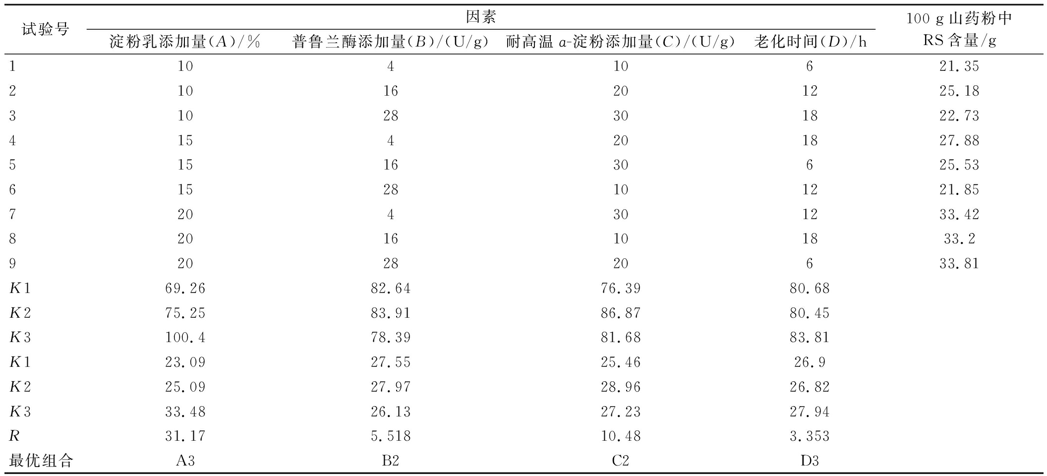 在单因素试验的基础上,以淀粉乳添加量(A)、普鲁兰酶添加量(B)、耐高温α-淀粉酶添加量(C)、老化时间(D)为考察因素,以山药RS含量为指标设计正交试验,因素水平见表1。
