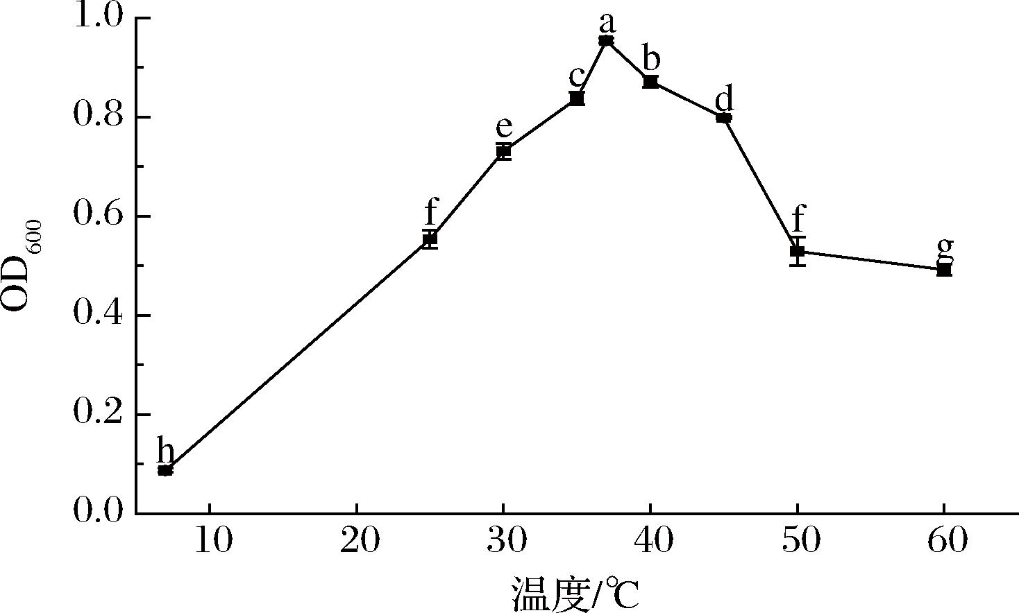 探究不同培养温度、初始pH、NaCl质量分数、葡萄糖质量分数、酒精体积分数对菌株生长的影响。采用液体培养,设定培养温度(7、25、30、35、37、40、45、50、60 ℃),初始pH 7.0;设定初始pH值(4.0、5.0、6.0、7.0、8.0、9.0、10.0),培养温度37 ℃;设定NaCl质量分数(0%、1%、3%、5%、7%、9%、10%、15%),初始pH 7.0,培养温度37 ℃;设定葡萄糖质量分数(0%、2%、10%、15%、20%、25%、30%、35%、40%),初始pH 7.0,培养温度37 ℃;设定酒精体积分数(0%、3%、6%、8%、10%、12%、14%、16%、18%、20%),初始pH 7.0,培养温度37 ℃。在150 r/min的条件下培养24 h后,测定各组的OD600值[16]。
